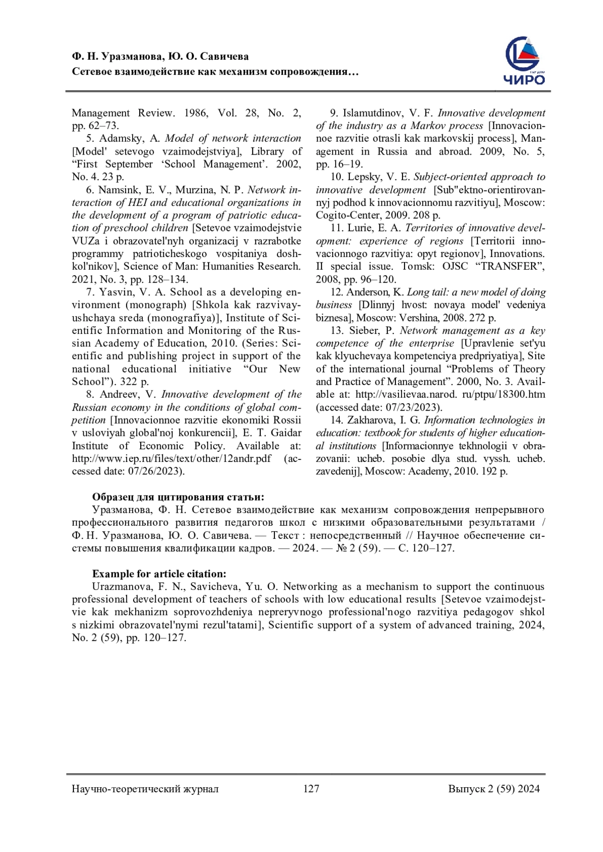 5. Адамский, А. Модель сетевого взаимодействия / А. Адамский. - Текст: непосредственный // Библиотека “Первого сентября.,Управление школой”. - 2002. - № 4. - С. 23.