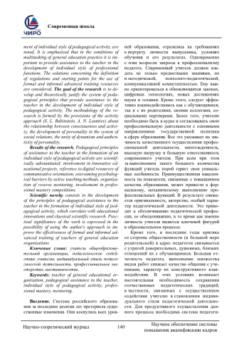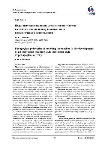 Проблема исследования и обоснование ее актуальности. Актуальность исследования связывается с поиском продуктивных подходов к обеспечению непрерывного профессионального развития учителя общеобразовательной организации. Отмечаются преимущества таких способов организации педагогической практики, которые основаны на совершенствовании индивидуального стиля педагогической деятельности. Подчеркивается, что в условиях многозадачности общеобразовательной практики важно обеспечить содействие учителю в становлении индивидуального стиля осуществления профессиональных функций. Перспективными для этого представляются решения, касающиеся определениях регламентов и исходных положений применения ресурсов формального и неформального повышения квалификации. Цель исследования состоит в разработке и теоретическом обосновании системы педагогических принципов, обеспечивающих содействие учителю в становлении индивидуального стиля педагогической деятельности. Методология (материалы и методы). Методологию исследования образуют положения деятельностного подхода (С. Л. Рубинштейна, А. Н. Леонтьева) о взаимосвязи сознания и деятельности, развитии личности в системе общественных отношений, единстве динамичности и аутентичности личности. Результаты исследования. Научно обоснованы педагогические принципы содействия учителю в становлении индивидуального стиля педагогической деятельности: вовлеченности в инновационные образовательные проекты, обращения к цифровым ресурсам коммуникативной направленности, преодоления психологических барьеров активными методами обучения, организации реверсивного наставничества, привлечения к участию в конкурсах профессионального мастерства. Научная новизна заключается в разработке принципов педагогического содействия учителю в становлении индивидуального стиля педагогической деятельности, которые соотносятся с образовательными инновациями и классическими научными исследованиями. Практическая значимость работы выражается в возможности применения авторского подхода для повышения эффективности формального и неформального повышения квалификации учителей общеобразовательных организаций.