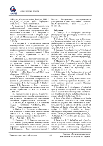 10. Снигирева, Е. М. Особенности развития индивидуального стиля педагогической деятельности учителя в системе дополнительного профессионального образования / Е. М. Снигирева. - Текст: непосредственный // Мир науки, культуры, образования. - 2012. - № 3. - С. 198-200. EDN: PCHXXJ