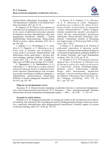 11. Малинин, В. А. Наставничество как действенная форма становления и развития личности молодого учителя / В. А. Малинин, Ф. В. Повшедная, О. В. Лебедева, А. В. Пугачев. - Текст: электронный // Вестник Мининского университета. - 2023. - Т. l. 11, № 1 (42). - URL: https://goo.su/UISK4 (дата обращения: 12.05.2024). EDN: HRCKNH