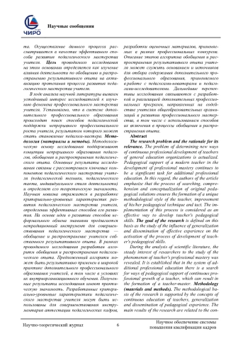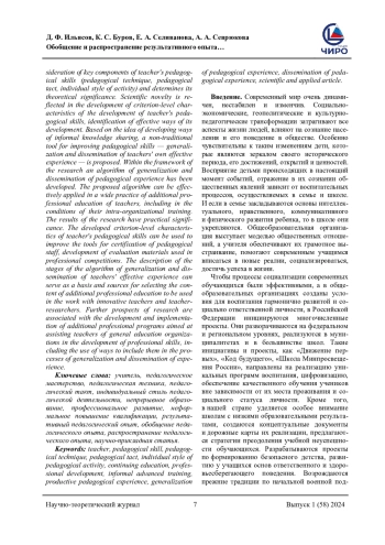 Проблема исследования и обоснование ее актуальности. Актуализируется проблема определения новых способов непрерывного профессионального развития учителей общеобразовательных организаций. Педагогическая поддержка современного учителя в развитии профессионального мастерства продолжает оставаться значимой задачей для дополнительного профессионального образования. В этой связи авторами статьи подчеркивается, что процесс поиска, осмысления и концептуализации оригинальных педагогических решений обеспечивает формирование уникального методического стиля учителя, совершенствование его педагогической техники и такта. Осуществление данного процесса рассматривается в качестве эффективного способа развития педагогического мастерства учителя. Цель проводимого исследования на этом основании определяется как изучение влияния деятельности по обобщению и распространению результативного опыта на активизацию протекания процесса развития педагогического мастерства учителя. В ходе анализа научной литературы выявлен устойчивый интерес исследователей к изучению феномена профессионального мастерства учителя. Установлено, что в системе дополнительного профессионального образования происходит поиск способов педагогической поддержки непрерывного профессионального роста учителя, результатом которого может стать становление педагога-мастера. Методология (материалы и методы). Методологическую основу исследования поддерживают концепции непрерывного образования педагогов, обобщения и распространения педагогического опыта. Основные результаты исследования связаны с рассмотрением ключевых компонентов педагогического мастерства учителя (педагогической техники, педагогического такта, индивидуального стиля деятельности) и определяет его теоретическую значимость. Научная новизна отражается в разработке критериально-уровневых характеристик развития педагогического мастерства учителя, определении эффективных способов его развития. На основе идеи о развитии способов неформального обмена знаниями предлагается нетрадиционный инструмент для совершенствования педагогического мастерства - обобщение и распространение учителем собственного результативного опыта. В рамках проводимого исследования разработан алгоритм обобщения и распространения педагогического опыта. Предложенный алгоритм может быть результативно применен в широкой практике дополнительного профессионального образования учителей, в том числе в условиях их внутриорганизационного обучения. Полученные результаты исследования имеют практическую значимость. Разработанные критериально-уровневые характеристики педагогического мастерства учителя могут быть использованы для совершенствования инструментария аттестации педагогических кадров, разработки оценочных материалов, применяемых в рамках профессиональных конкурсов. Описание этапов алгоритма обобщения и распространения результативного опыта учителя может служить основанием и источников для отбора содержания дополнительного профессионального образования, применяемого в работе с педагогами-новаторами и педагогами-исследователями. Дальнейшие перспективы исследования связываются с разработкой и реализацией дополнительных профессиональных программ, направленных на 