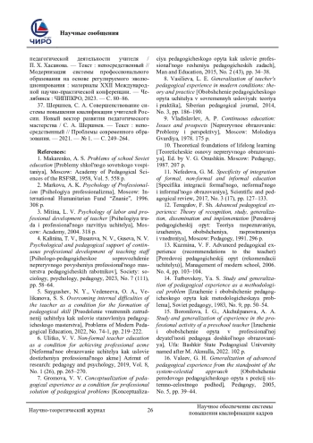 8. Васильева, Л. Е. Обобщение педагогического опыта учителя в современных условиях: теория и практика / Л. Е. Васильева. - Текст: непосредственный // Сибирский педагогический журнал. - 2014. - № 3. - С. 186-190. EDN: SHAYRD