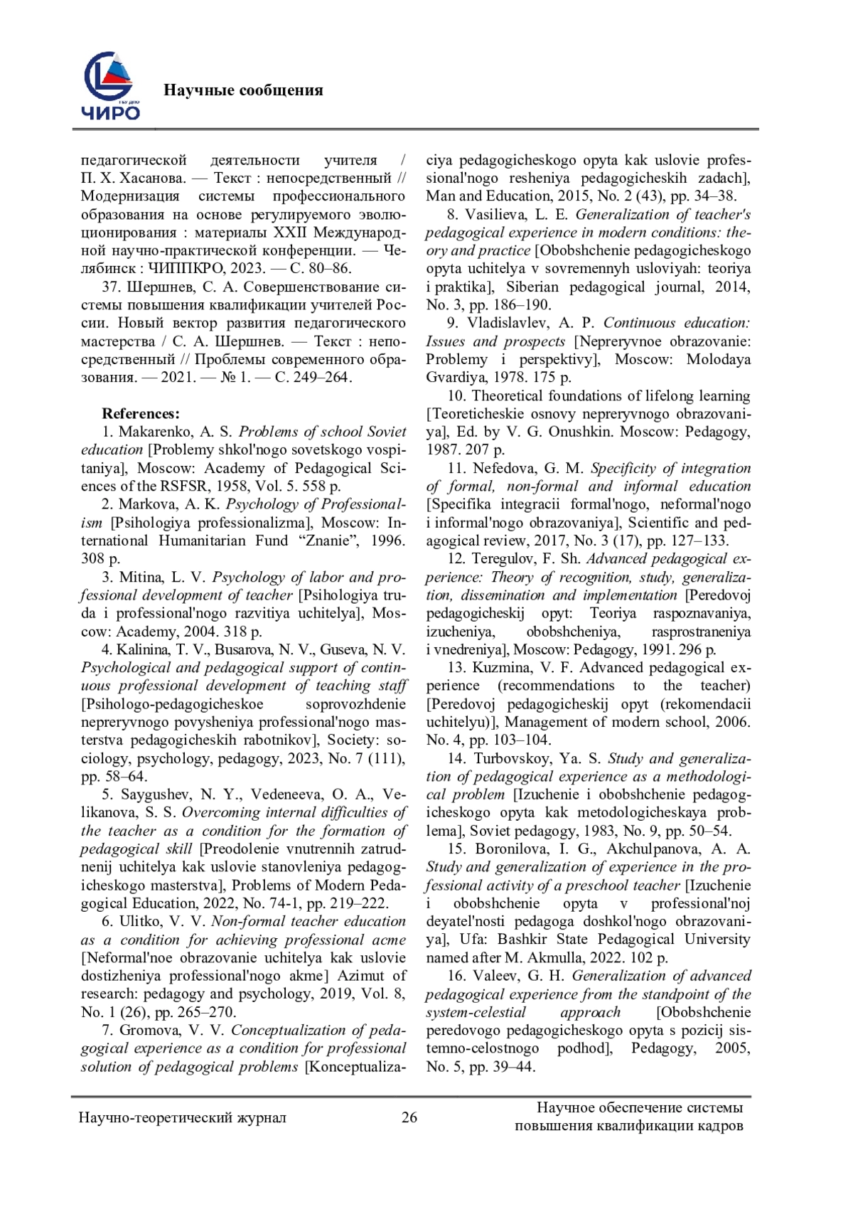 37. Шершнев, С. А. Совершенствование системы повышения квалификации учителей России. Новый вектор развития педагогического мастерства / С. А. Шершнев. - Текст: непосредственный // Проблемы современного образования. - 2021. - № 1. - С. 249-264. EDN: TIUOIU
