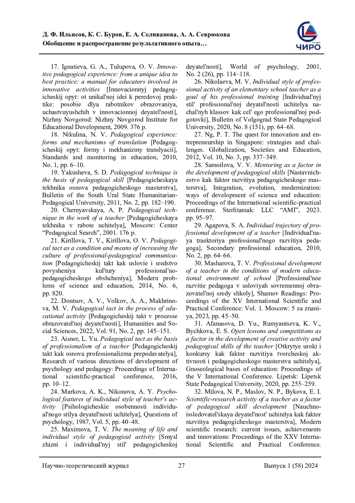17. Игнатьева, Г. А. Инновационный педагогический опыт: от уникальной идеи к передовой практике: пособие для работников образования, участвующих в инновационной деятельности / Г. А. Игнатьева, О. В. Тулупова. - Нижний Новгород: Нижегородский ин-т развития образования, 2009. - 376 с. - Текст: непосредственный. EDN: QXZLUT