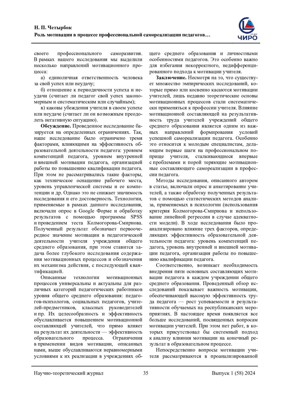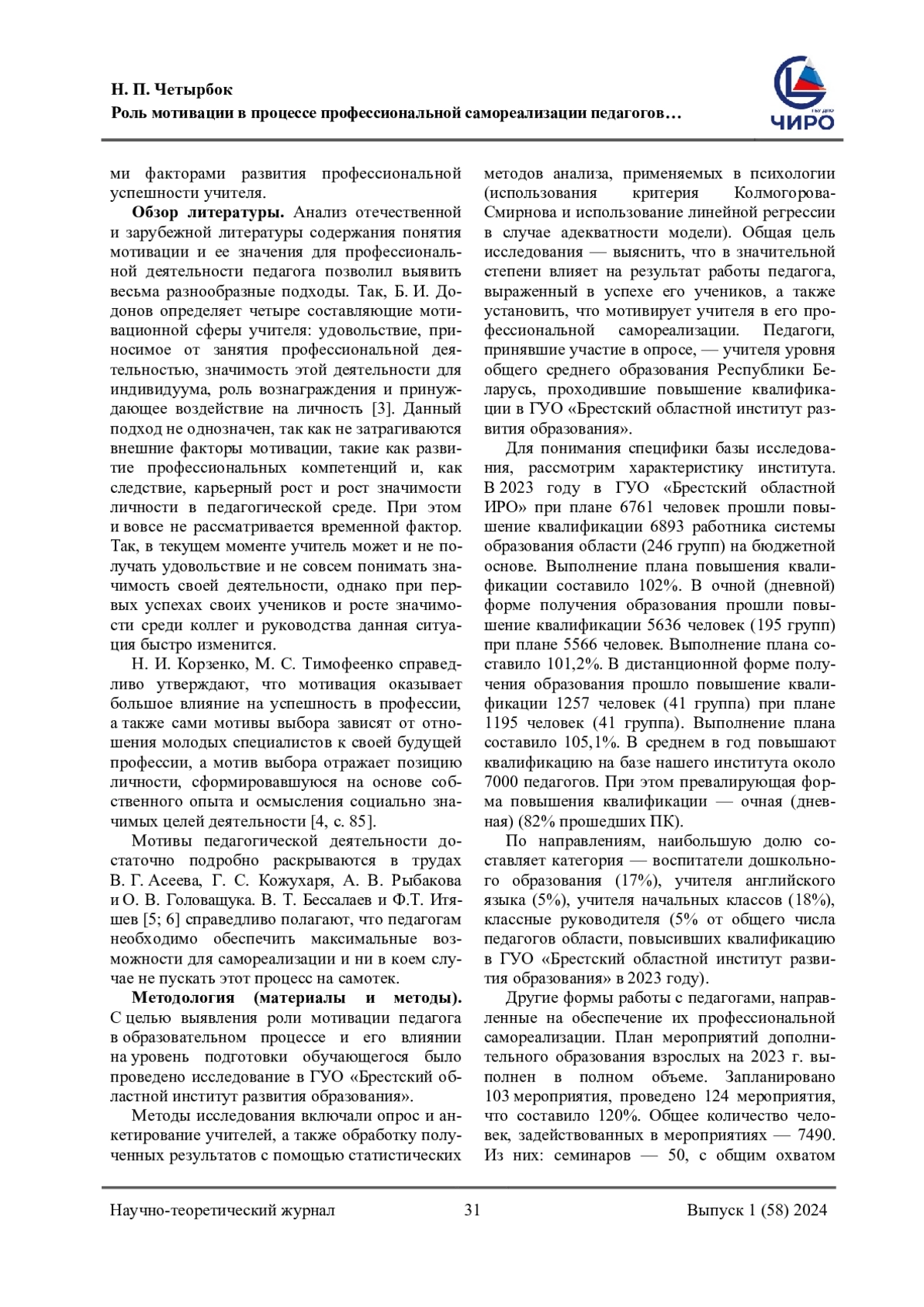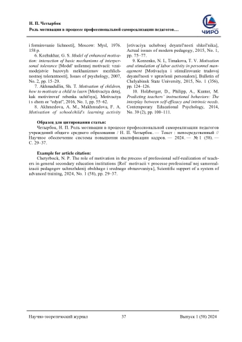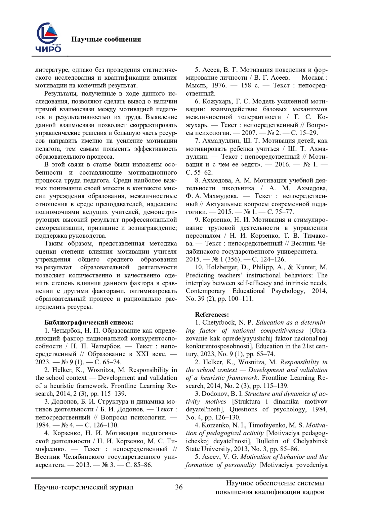 4. Корзенко, Н. И. Мотивация педагогической деятельности / Н. И. Корзенко, М. С. Тимофеенко. - Текст: непосредственный // Вестник Челябинского государственного университета. - 2013. - № 3. - С. 85-86. EDN: QBVKSX
