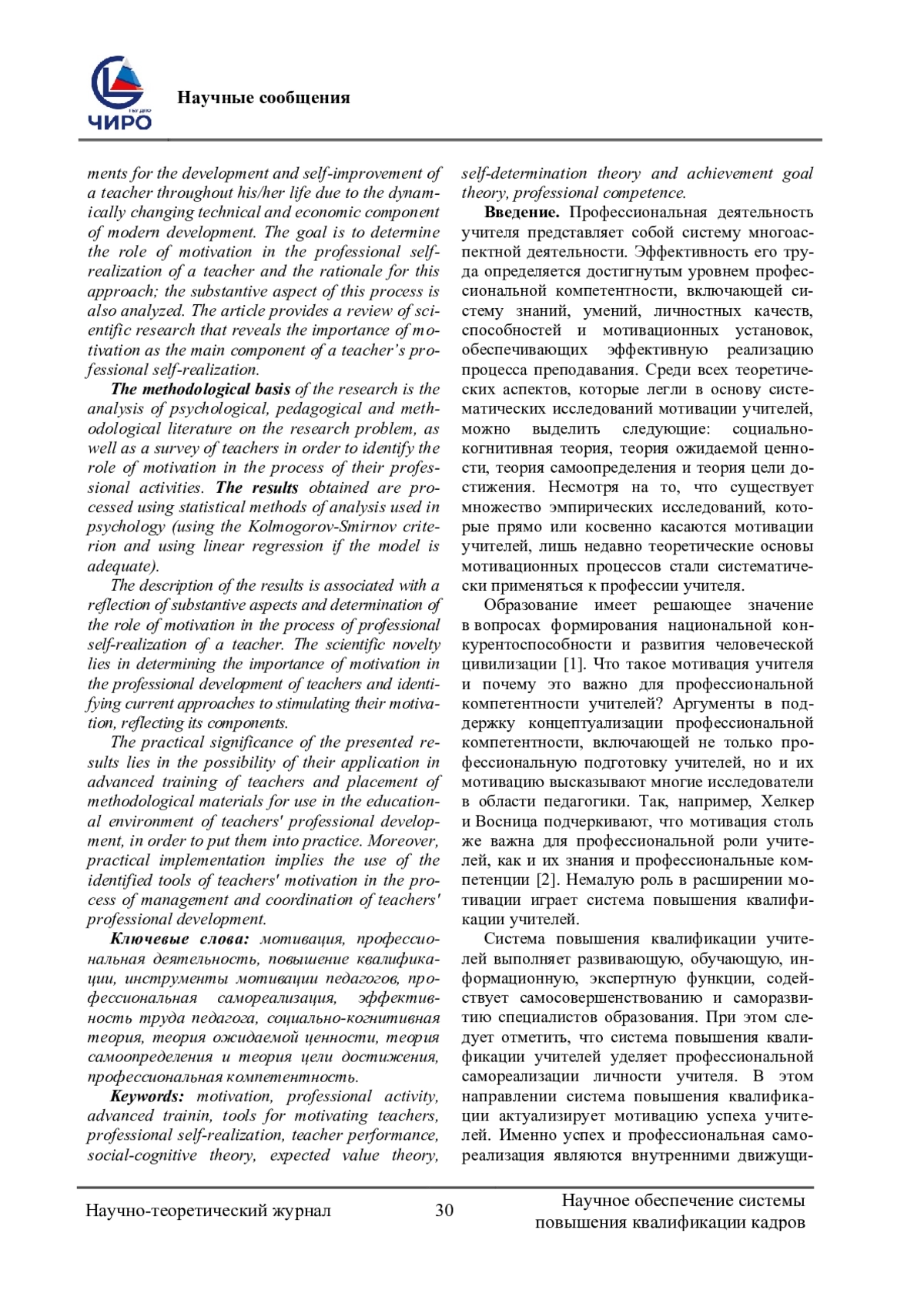 Проблема исследования и обоснование ее актуальности. В статье анализируется роль и значение мотивации педагога в образовательном процессе для уровня общего среднего образования[1], а также устанавливается степень этого влияния в сравнении с другими факторами. Тема является актуальной ввиду постоянно растущих требований к развитию и самосовершенствованию педагога на протяжении всей жизни ввиду динамично меняющейся технико-экономической составляющей современного развития. Ставится цель определения роли мотивации в профессиональной самореализации педагога и обоснование данного подхода, также анализируется содержательный аспект данного процесса. В статье проводится обзор научных исследований, позволяющий обнаружить значимость мотивации как основной составляющей профессиональной самореализации педагога. Методология (материалы и методы). Методологической основой исследования выступают анализ психолого-педагогической и методической литературы по проблеме исследования, а также анкетирование педагогов с целью выявления роли мотивации в процессе их профессиональной деятельности. Обработка полученных результатов проводится с помощью статистических методов анализа, применяемых в психологии (использование критерия Колмогорова-Смирнова и применение линейной регрессии в случае адекватности модели). Описание результатов связывается с отражением содержательных аспектов и определением роли мотивации в процессе профессиональной самореализации педагога. Научная новизна заключается в определении значения мотивации в профессиональном развитии педагогов и обозначении актуальных подходов к стимулированию их мотивации с отражением ее составляющих. Практическая значимость представленных результатов заключается в возможности их применения в повышении квалификации учителей и размещении методических материалов для использования в образовательной среде профессионального развития педагогов, с целью их практического применения. Также практическая реализация подразумевает использование выявленных инструментов мотивации педагогов в процессе управления и координации профессионального развития учителей.