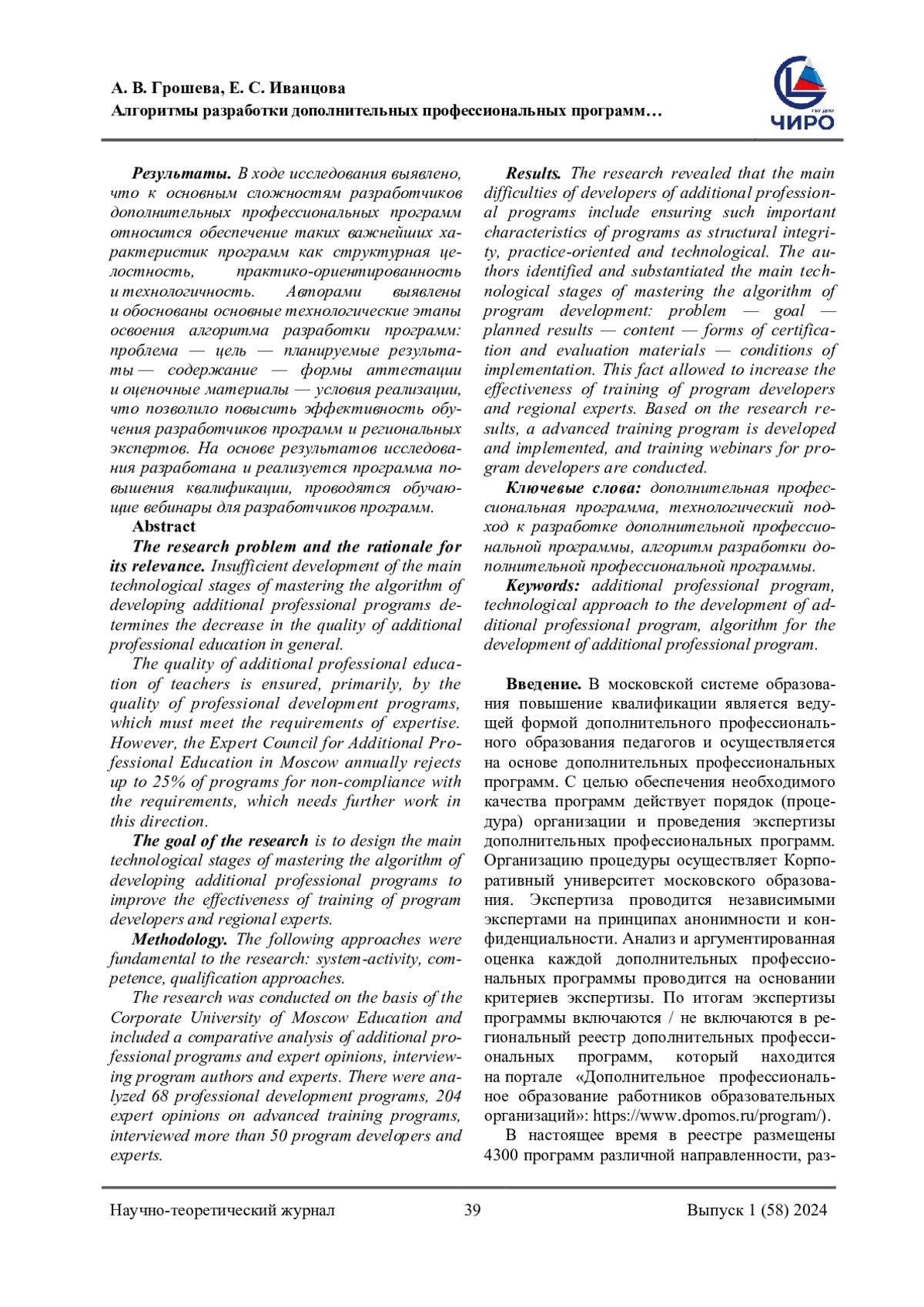 8. Грошева, А. В. Повышение качества дополнительных профессиональных программ: технологические аспекты / А. В. Грошева, Е. С. Иванцова. - Текст: непосредственный // Методист. - 2023. - № 7. - С. 14-16. EDN: PVBKGT