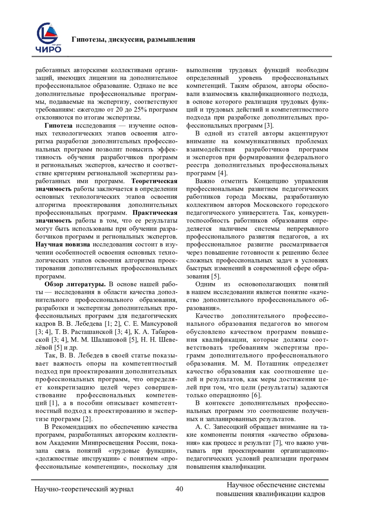 1. Лебедев, В. В. О дополнительных профессиональных программах повышения квалификации педагогических работников / В. В. Лебедев. - Текст: непосредственный // Школьные технологии. - 2018. - № 3. - С. 110-118. EDN: UYYTJS
