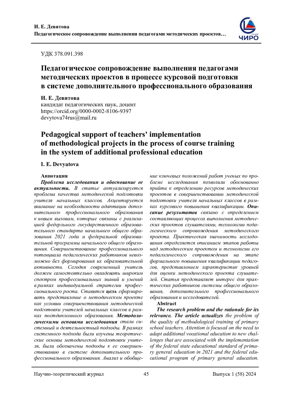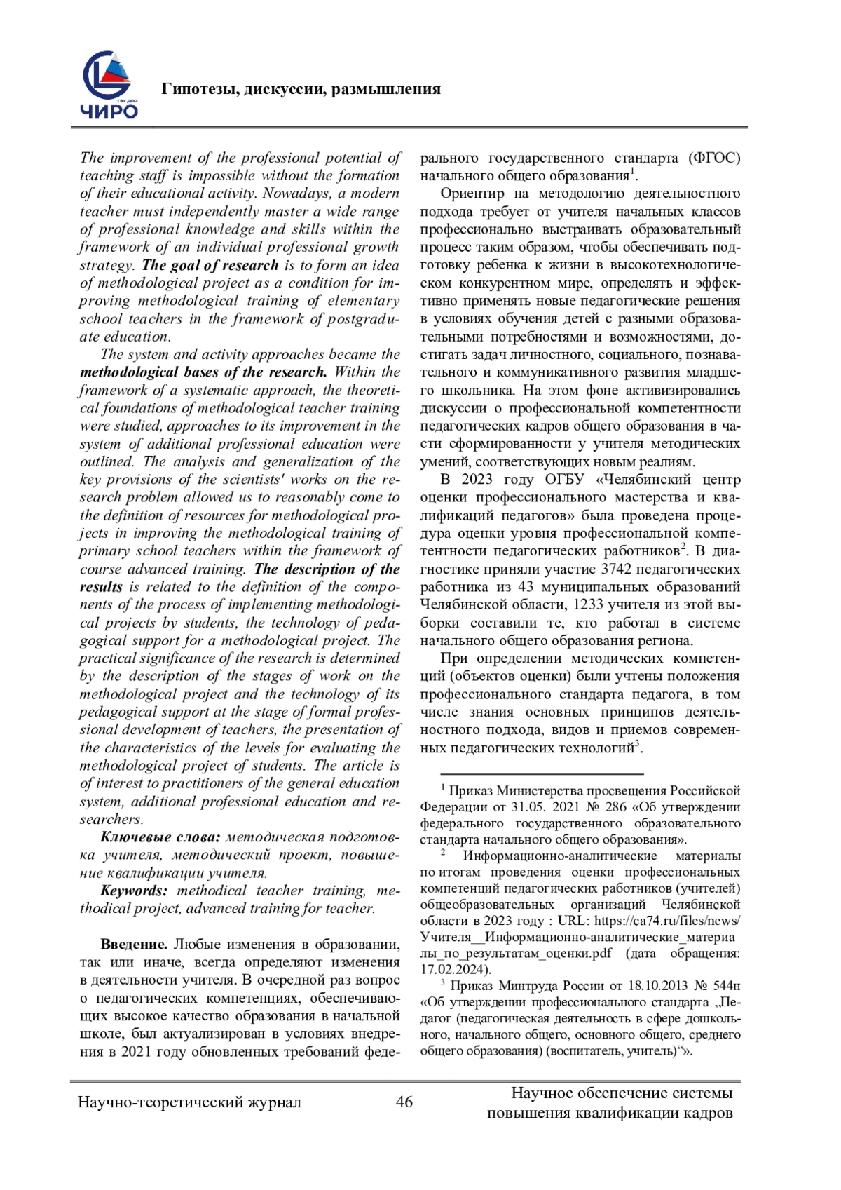 Проблема исследования и обоснование ее актуальности. В статье актуализируется проблема качества методической подготовки учителя начальных классов. Акцентируется внимание на необходимости адаптации дополнительного профессионального образования к новым вызовам, которые связаны с реализацией федерльного государственного образовательного стандарта начального общего образования 2021 года и федеральной образовательной программы начального общего образования. Совершенствование профессионального потенциала педагогических работников невозможно без формирования их образовательной активности. Сегодня современный учитель должен самостоятельно овладевать широким спектром профессиональных знаний и умений в рамках индивидуальной стратегии профессионального роста. Ставится цель сформировать представление о методическом проекте как условии совершенствования методической подготовки учителей начальных классов в рамках постдипломного образования. Методологическими основами исследования стали системный и деятельностный подходы. В рамках системного подхода были изучены теоретические основы методической подготовки учителя, были обозначены подходы к ее совершенствованию в системе дополнительного профессионального образования. Анализ и обобщение ключевых положений работ ученых по проблеме исследования позволили обоснованно прийти к определению ресурсов методических проектов в совершенствовании методической подготовки учителя начальных классов в рамках курсового повышения квалификации. Описание результатов связано с определением составляющих процесса выполнения методических проектов слушателями, технологии педагогического сопровождения методического проекта. Практическая значимость исследования определяется описанием этапов работы над методическим проектом и технологии его педагогического сопровождения на этапе формального повышения квалификации педагогов, представлением характеристик уровней для оценки методического проекта слушателей. Статья представляет интерес для практических работников системы общего образования, дополнительного профессионального образования и исследователей.