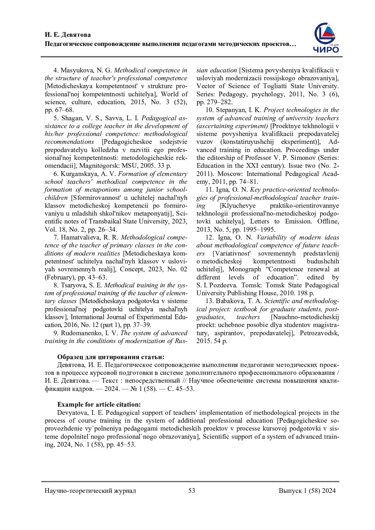 9. Рудоманенко, И. В. Система повышения квалификации в условиях модернизации российского образования / И. В. Рудоманенко. - Текст: непосредственный // Вектор науки Тольяттинского государственного университета. Серия: Педагога, психология. - 2011. - № 3 (6). - С. 279-282.