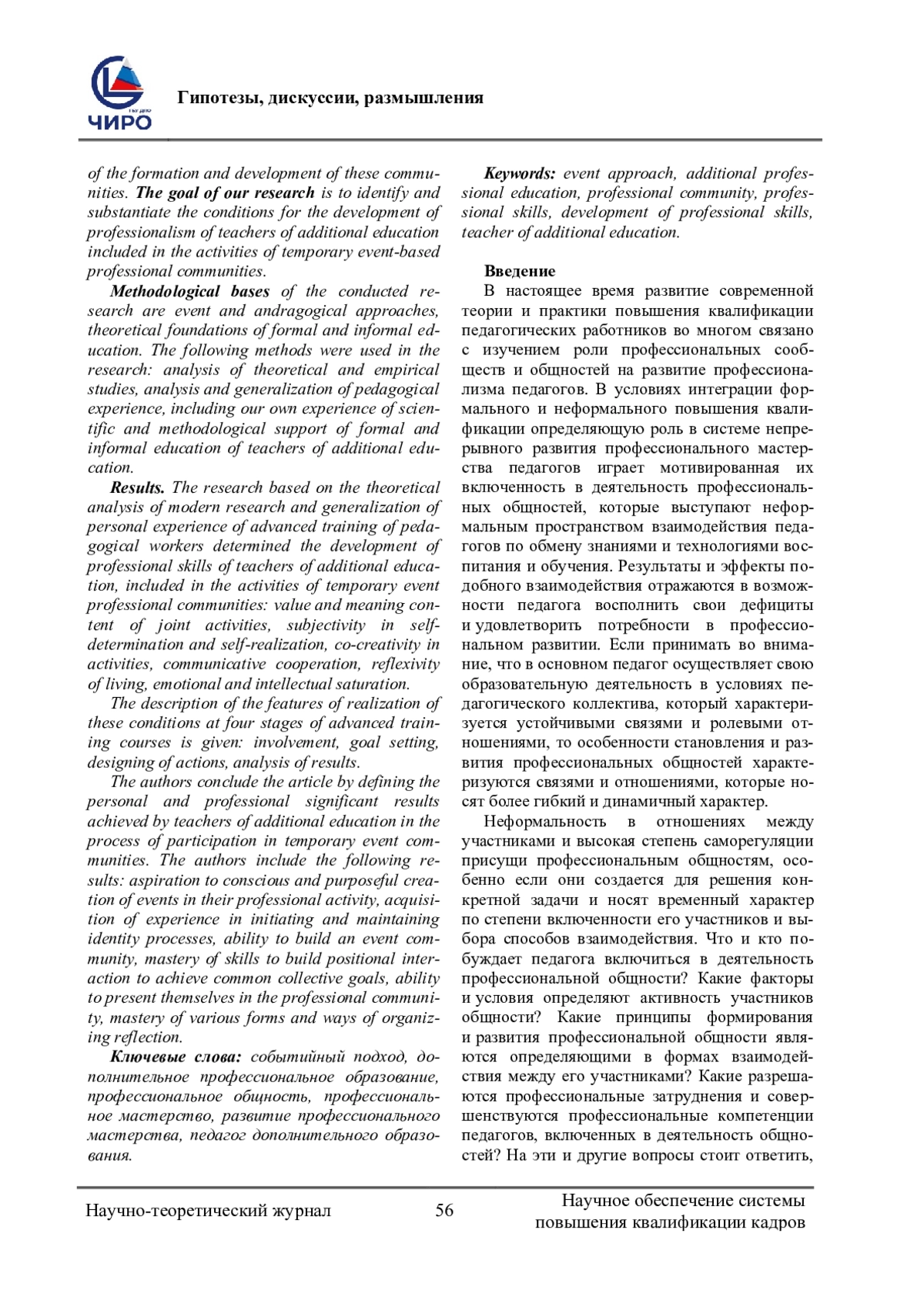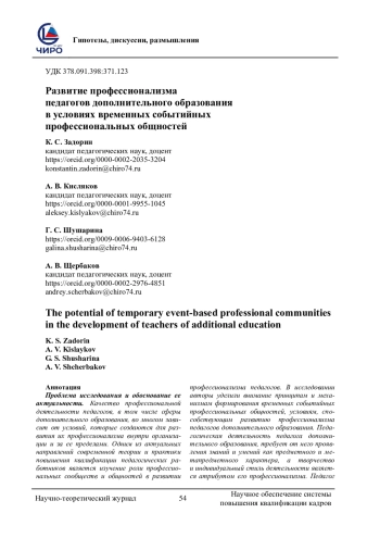 Проблема исследования и обоснование ее актуальности. Качество профессиональной деятельности педагогов, в том числе сферы дополнительного образования, во многом зависит от условий, которые создаются для развития их профессионализма внутри организации и за ее пределами. Одним из актуальных направлений современной теории и практики повышения квалификации педагогических работников является изучение роли профессиональных сообществ и общностей в развитии профессионализма педагогов. В исследовании авторы уделили внимание принципам и механизмам формирования временных событийных профессиональных общностей, условиям, способствующим развитию профессионализма педагогов дополнительного образования. Педагогическая деятельность педагога дополнительного образования, требует от него проявления знаний и умений как предметного и метапредметного характера, а творчество и индивидуальный стиль деятельности является атрибутом его профессионализма. Педагог сферы дополнительного образования четко понимает мотивационную основу выбора ребенком занятий в детском объединении, где его активность напрямую связана с созданием ситуации успеха в достижении результатов при освоении содержания дополнительной общеобразовательной программы. Именно поэтому исследование потенциала временных событийных профессиональных общностей в развитии профессионализма педагогов дополнительного образования имеет синергийный характер, учитывая специфику как педагогической деятельности педагога сферы дополнительного образования, так и характер формирования и развития данных общностей. Целью нашего исследования является выявление и обоснование условий развития профессионализма педагогов дополнительного образования, включенных в деятельность временных событийных профессиональных общностей. Методологическими основаниями проведенного исследования являются событийный и андрагогический подходы, теоретические основы формального и неформального образования. В исследовании были использованы следующие методы: анализ теоретических и эмпирических исследований, анализ и обобщение педагогического опыта, в том числе собственного опыта научно-методического сопровождения формального и неформального образования педагогов дополнительного образования. Результаты. В исследовании на основе теоретического анализа современных исследований и обобщения личного опыта повышения квалификации педагогических работников определены особенности развития профессионального мастерства педагогов дополнительного образования, включенных в деятельность временных событийных профессиональных общностей: ценностно-смысловое содержание совместной деятельности, субъектность в самоопределении и самореализации, сотворчество в деятельности, коммуникативная кооперация, рефлексивность проживания, эмоциональная и интеллектуальная насыщенность. Дано описание особенностей реализации этих условий на четырех этапах обучения на курсах повышения квалификации: вовлечение, целеполагание, проектирование действий, анализ результатов. В завершение статьи авторы определяют личностно-профессиональные значимые результаты, достигаемые педагогами дополнительного образования в процессе участия во временных событийных общностях. К таким результатам авто
