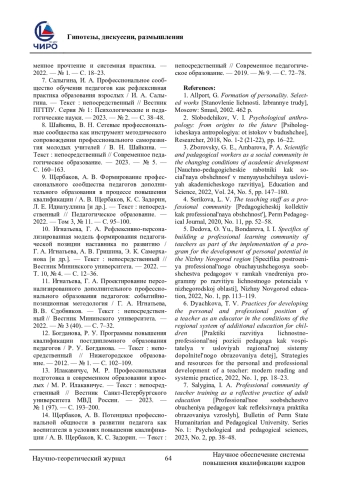7. Салыгина, И. А. Профессиональное сообщество обучения педагогов как рефлексивная практика образования взрослых / И. А. Салыгина. - Текст: непосредственный // Вестник ПГГПУ. Серия № 1: Психологические и педагогические науки. - 2023. - № 2. - С. 38-48.
