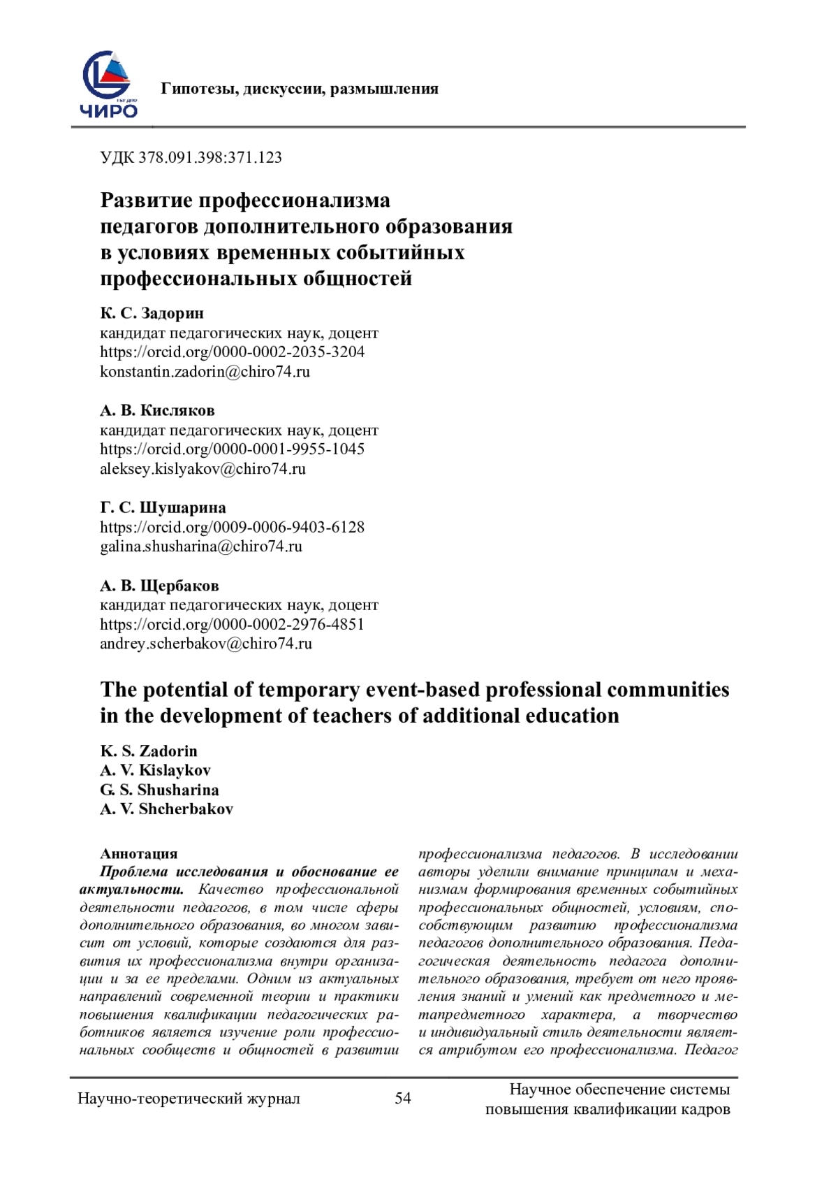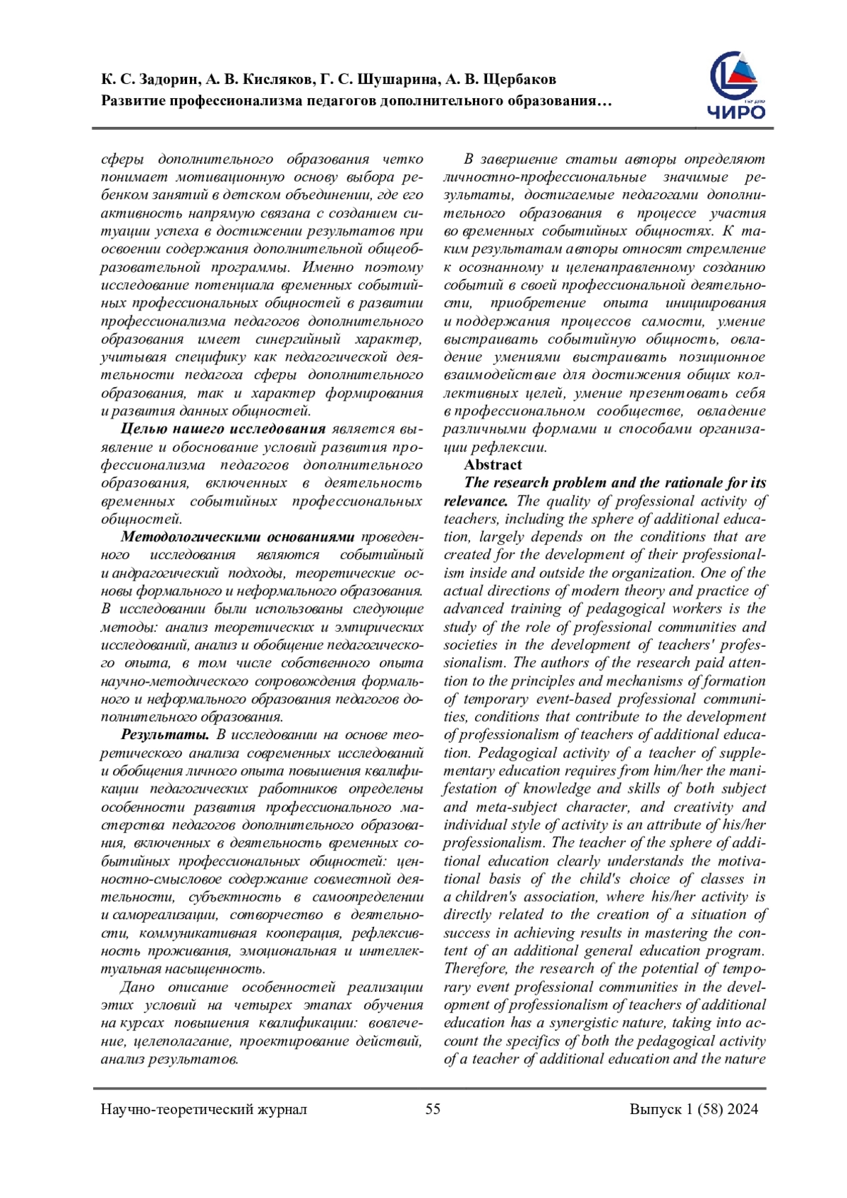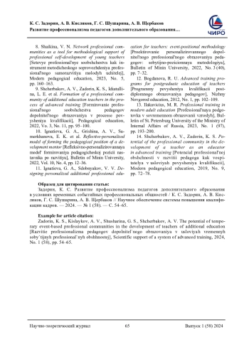 9. Щербаков, А. В. Формирование профессионального сообщества педагогов дополнительного образования в процессе повышения квалификации / А. В. Щербаков, К. С. Задорин, Л. Е. Идиатуллина [и др.]. - Текст: непосредственный // Педагогическое образование. - 2022. - Том 3, № 11. - С. 95-100.