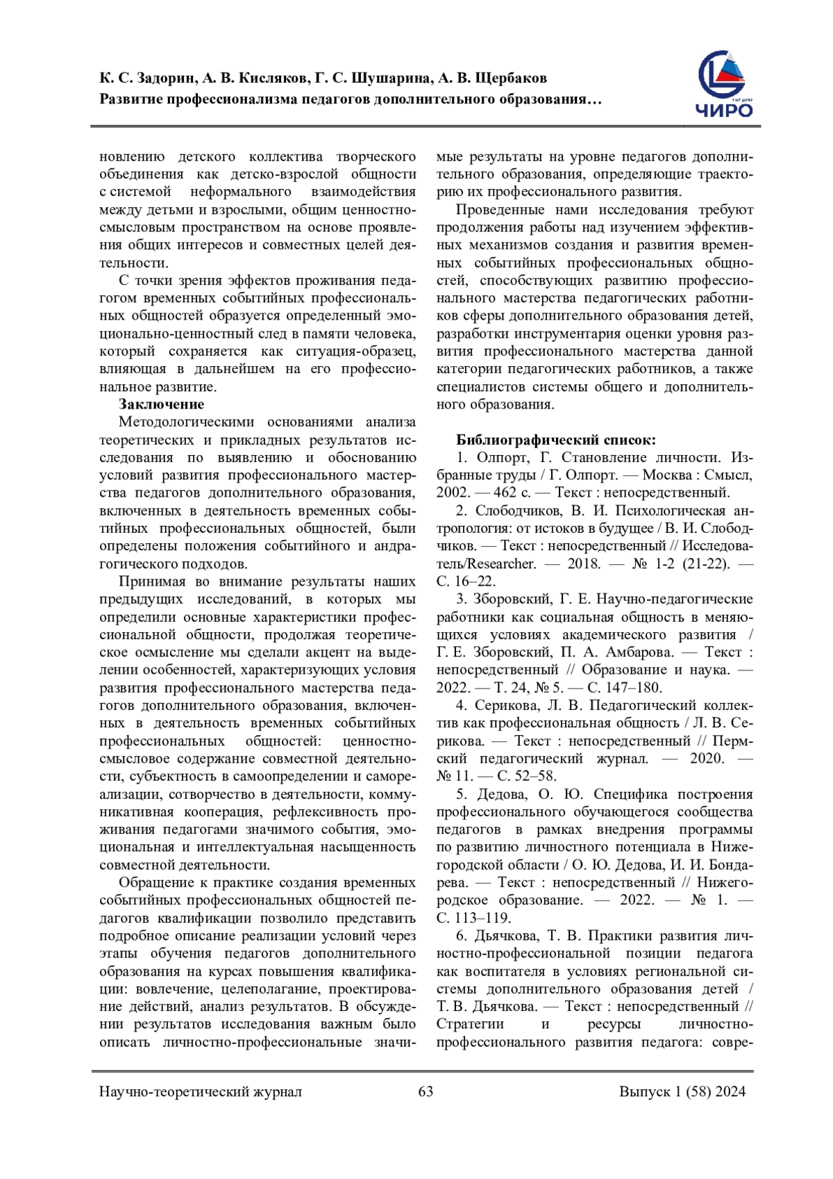 4. Серикова, Л. В. Педагогический коллектив как профессиональная общность / Л. В. Серикова. - Текст: непосредственный // Пермский педагогический журнал. - 2020. - № 11. - С. 52-58. EDN: REAZPY