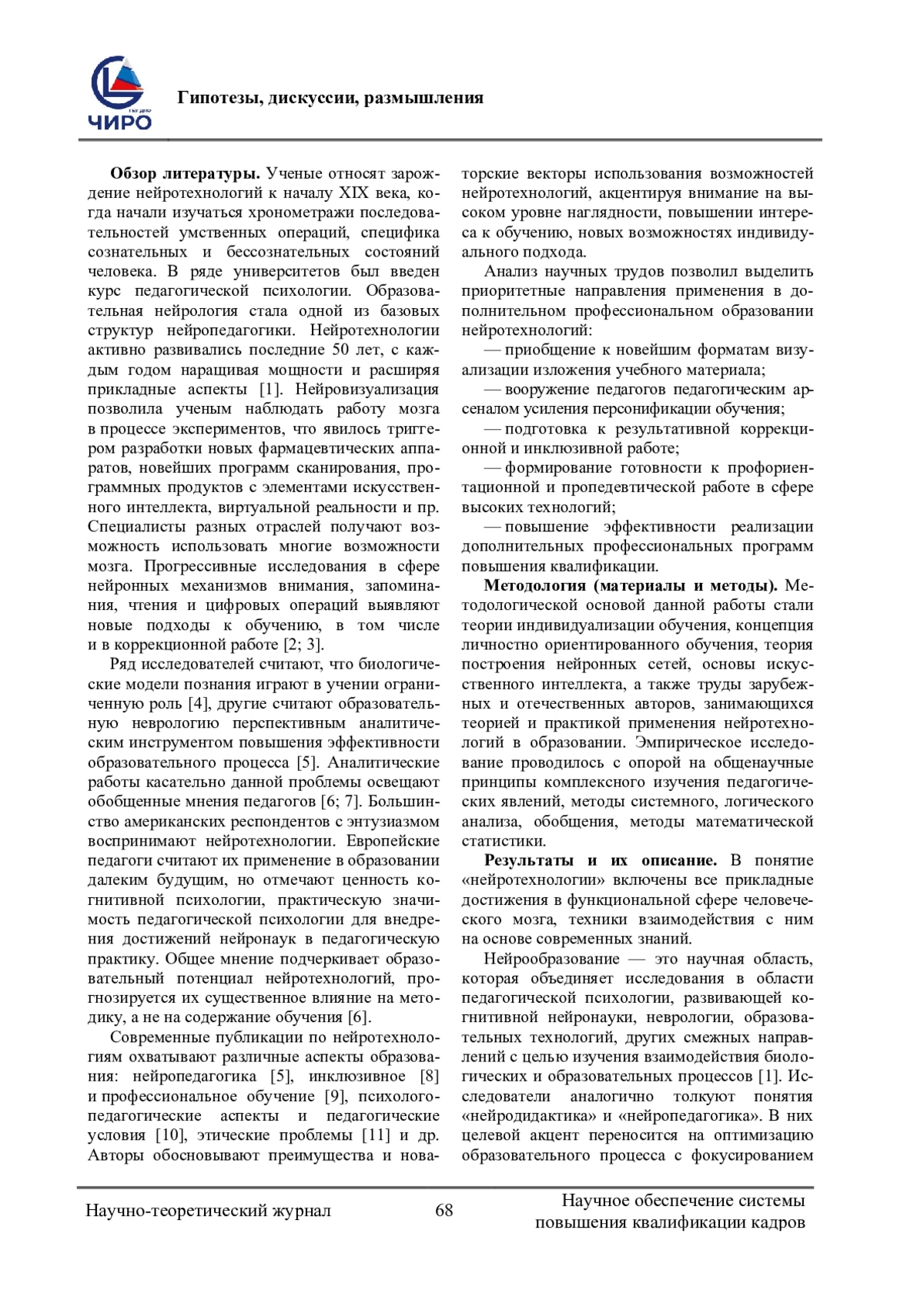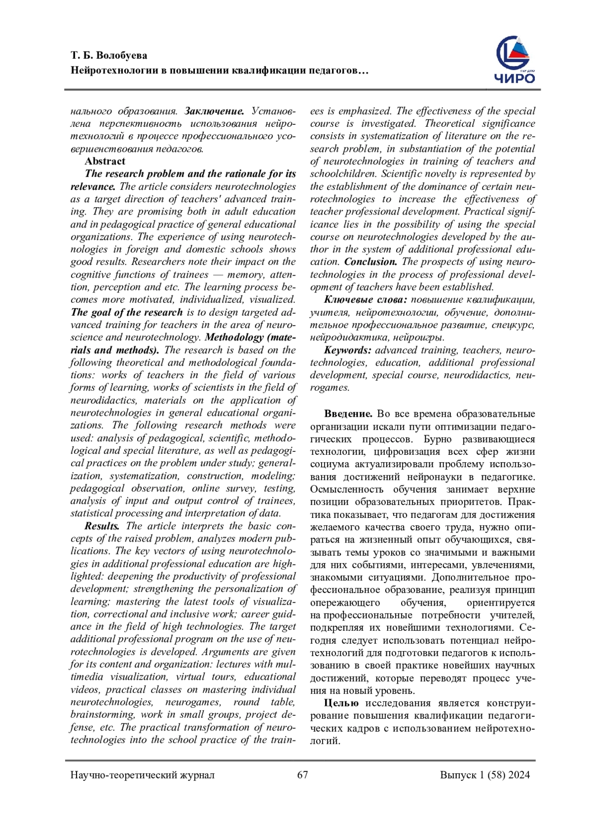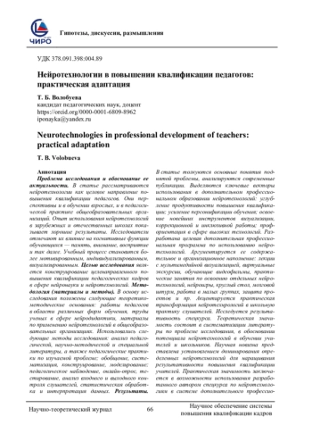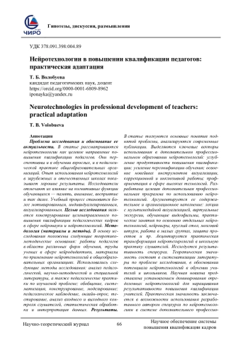 Проблема исследования и обоснование ее актуальности. В статье рассматриваются нейротехнологии как целевое направление повышения квалификации педагогов. Они перспективны и в обучении взрослых, и в педагогической практике общеобразовательных организаций. Опыт использования нейротехнологий в зарубежных и отечественных школах показывает хорошие результаты. Исследователи отмечают их влияние на когнитивные функции обучающихся - память, внимание, восприятие и так далее. Учебный процесс становится более мотивированным, индивидуализированным, визуализированным. Целью исследования является конструирование целенаправленного повышения квалификации педагогических кадров в сфере нейронауки и нейротехнологий. Методология (материалы и методы). В основу исследования положены следующие теоретико-методические основания: работы педагогов в области различных форм обучения, труды ученых в сфере нейродидактики, материалы по применению нейротехнологий в общеобразовательных организациях. Использовались следующие методы исследования: анализ педагогической, научно-методической и специальной литературы, а также педагогические практики по изучаемой проблеме; обобщение, систематизация, конструирование, моделирование; педагогическое наблюдение, онлайн-опрос, тестирование, анализ входного и выходного контроля слушателей, статистическая обработка и интерпретация данных.