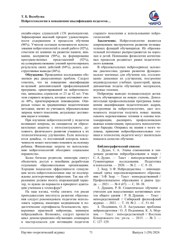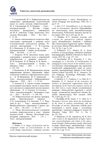 1. Дудко, С. А. Этапы становления и тенденции развития нейрообразования в мире / С. А. Дудко. - Текст: непосредственный // Гуманитарные исследования. Педагогика и психология. - 2020. - № 2. - С. 9-18. EDN: WSMXER
