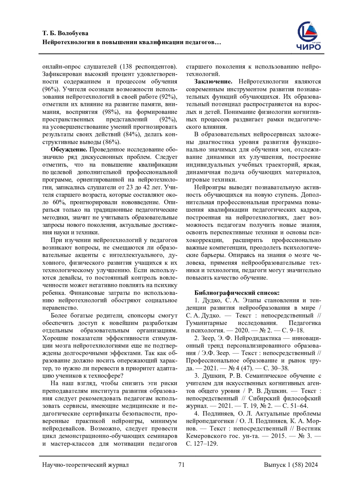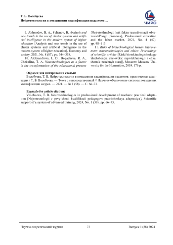 10. Нейротехнологии как фактор трансформации образовательного процесса / Л. Д. Александрова, Р.А. Богачева, Т. А. Чекалина [и др.]. - Текст: непосредственный // Профессиональное образование и рынок труда. - 2021. - № 4 (47). - С. 98-113. EDN: MRXMRW