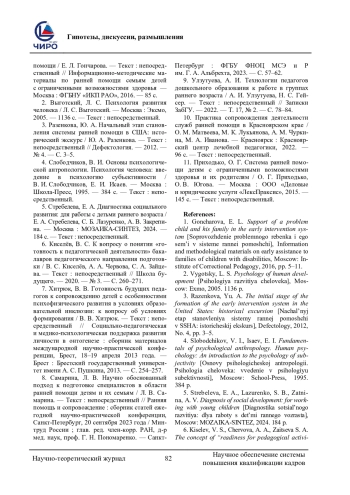 1. Гончарова, Е. Л. Сопровождение проблемного ребенка и его семьи в системе ранней помощи / Е. Л. Гончарова. - Текст: непосредственный // Информационно-методические материалы по ранней помощи семьям детей с ограниченными возможностями здоровья - Москва: ФГБНУ “ИКП РАО”, 2016. - 85 с.
