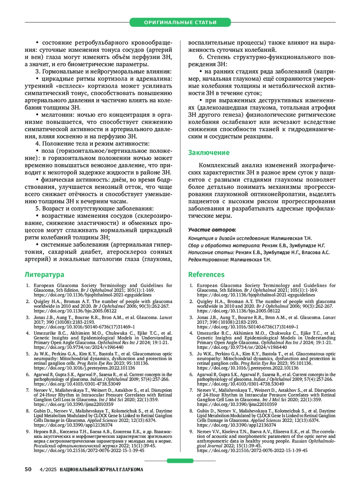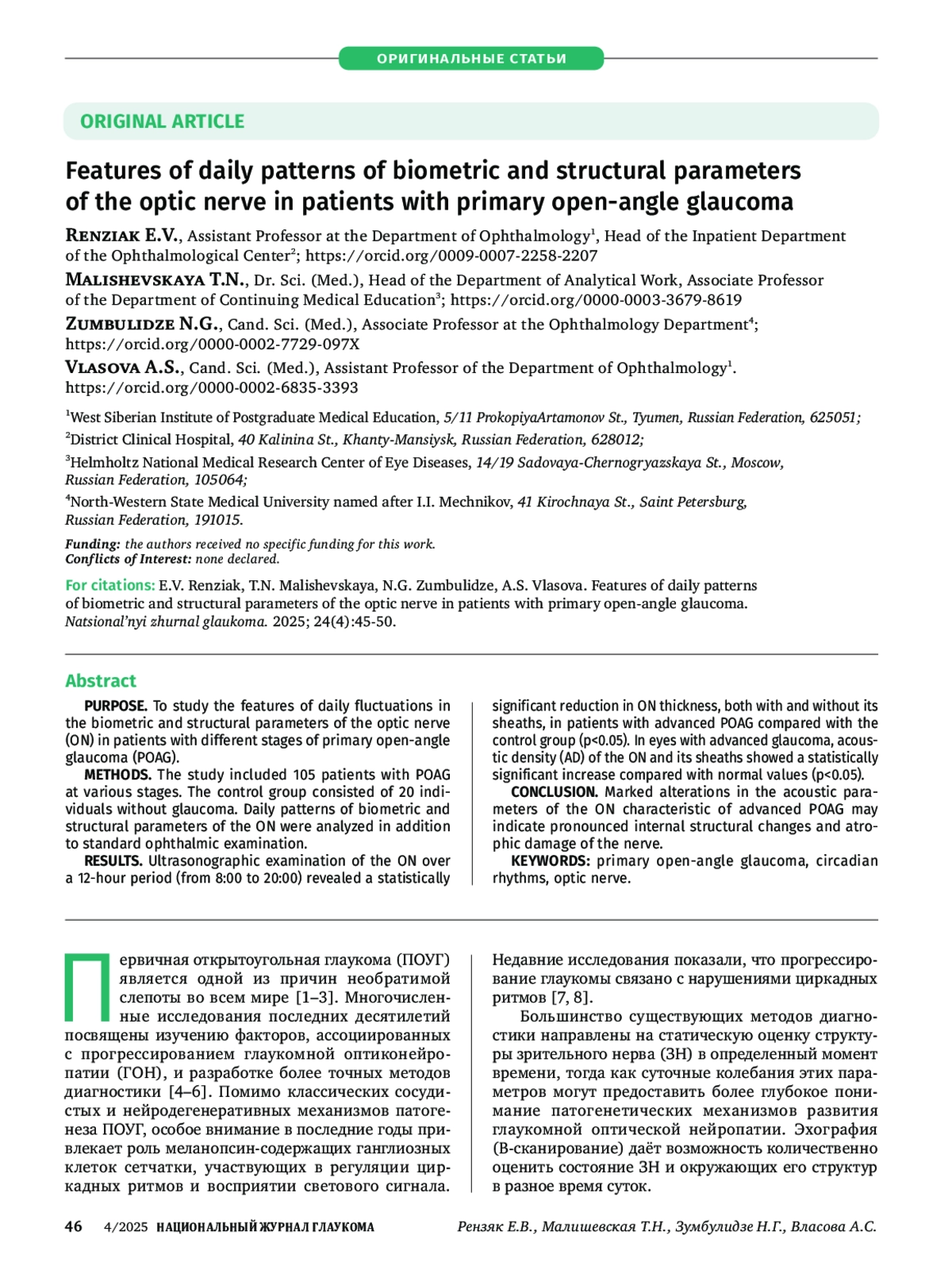 ЗУМБУЛИДЗЕ Н. Г., РЕНЗЯК Е. В., МАЛИШЕВСКАЯ Т. Н., ВЛАСОВА А.С. ОСОБЕННОСТИ СУТОЧНЫХ ПАТТЕРНОВ БИОМЕТРИЧЕСКИХ И СТРУКТУРНЫХ ПАРАМЕТРОВ ЗРИТЕЛЬНОГО НЕРВА У ПАЦИЕНТОВ С ПЕРВИЧНОЙ ОТКРЫТОУГОЛЬНОЙ ГЛАУКОМОЙ // НАЦИОНАЛЬНЫЙ ЖУРНАЛ ГЛАУКОМА. 2025. № 4, ТОМ 24