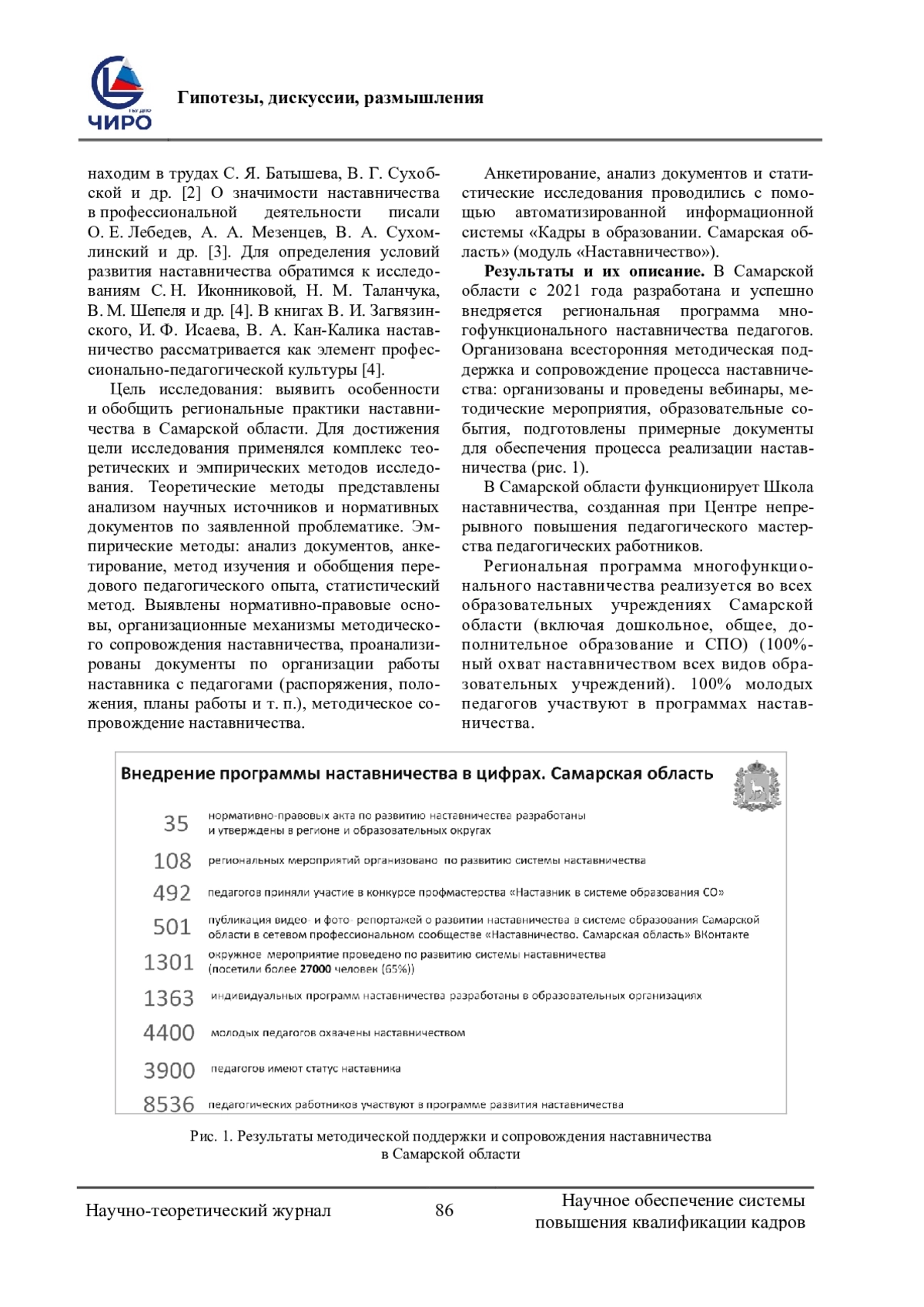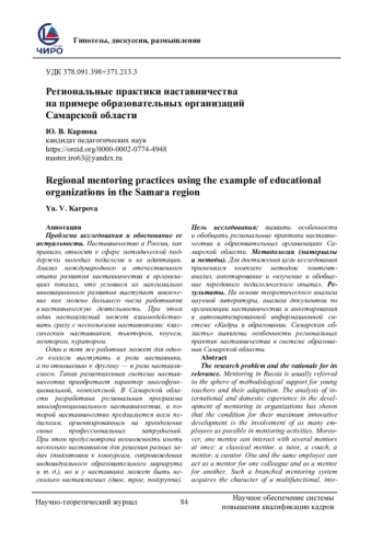 Проблема исследования и обоснование ее актуальности. Наставничество в России, как правило, относят к сфере методической поддержки молодых педагогов и их адаптации. Анализ международного и отечественного опыта развития наставничества в организациях показал, что условием их максимально инновационного развития выступает вовлечение как можно большего числа работников в наставническую деятельность. При этом один наставляемый может взаимодействовать сразу с несколькими наставниками: классическим наставником, тьютором, коучем, ментором, куратором. Один и тот же работник может для одного коллеги выступать в роли наставника, а по отношению к другому - в роли наставляемого. Такая разветвленная система наставничества приобретает характер многофункциональной, комплексной. В Самарской области разработана региональная программа многофункционального наставничества, в которой наставничество предлагается всем педагогам, ориентированным на преодоление своих профессиональных затруднений. При этом предусмотрена возможность иметь несколько наставников для решения разных задач (подготовки к конкурсам, сопровождения индивидуального образовательного маршрута и т. д.), но и у наставника может быть несколько наставляемых (двое, трое, подгруппа). Цель исследования: выявить особенности и обобщить региональные практики наставничества в образовательных организациях Самарской области. Методология (материалы и методы). Для достижения цели исследования применялся комплекс методов: контент-анализ, анкетирование и «изучение и обобщение передового педагогического опыта». Результаты. На основе теоретического анализа научной литературы, анализа документов по организации наставничества и анкетирования в автоматизированной информационной системе «Кадры в образовании. Самарская область» выявлены особенности региональных практик наставничества в системе образования Самарской области.
