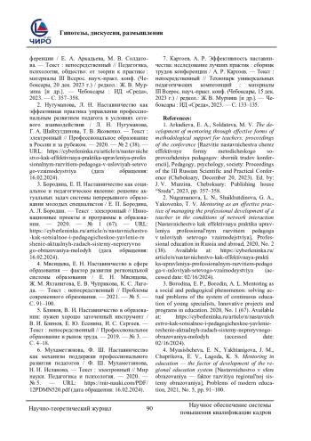 7. Картоев, А. Р. Эффективность наставничества: исследование лучших практик: сборник трудов конференции / А. Р. Картоев. - Текст: непосредственный // Технопарк универсальных педагогических компетенций: материалы III Всерос. науч.-практ. конф. (Чебоксары, 15 дек. 2023 г.) / редкол.: Ж. В. Мурзина [и др.]. - Чебоксары: ИД “Среда”, 2023. - С. 133-135. EDN: AHCFGF