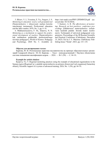 6. Мухаметзянова, Ф. Ш. Наставничество как механизм поддержки профессионального развития педагогов / Ф. Ш. Мухаметзянова, Н. Н. Исланова. - Текст: электронный // Мир науки. Педагогика и психология. - 2020. - № 5. - URL: https://mir-nauki.com/PDF/12PDMN520.pdf (дата обращения: 16.02.2024). EDN: FVMREF