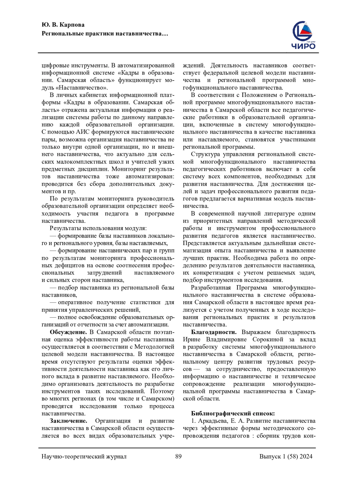 1. Аркадьева, Е. А. Развитие наставничества через эффективные формы методического сопровождения педагогов: сборник трудов конференции / Е. А. Аркадьева, М. В. Солдатова. - Текст: непосредственный // Педагогика, психология, общество: от теории к практике: материалы III Всерос. науч.-практ. конф. (Чебоксары, 20 дек. 2023 г.) / редкол.: Ж. В. Мурзина [и др.]. - Чебоксары: ИД “Среда”, 2023. - С. 357-358. EDN: HBUASZ