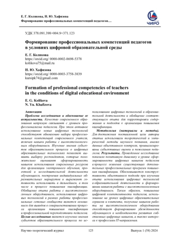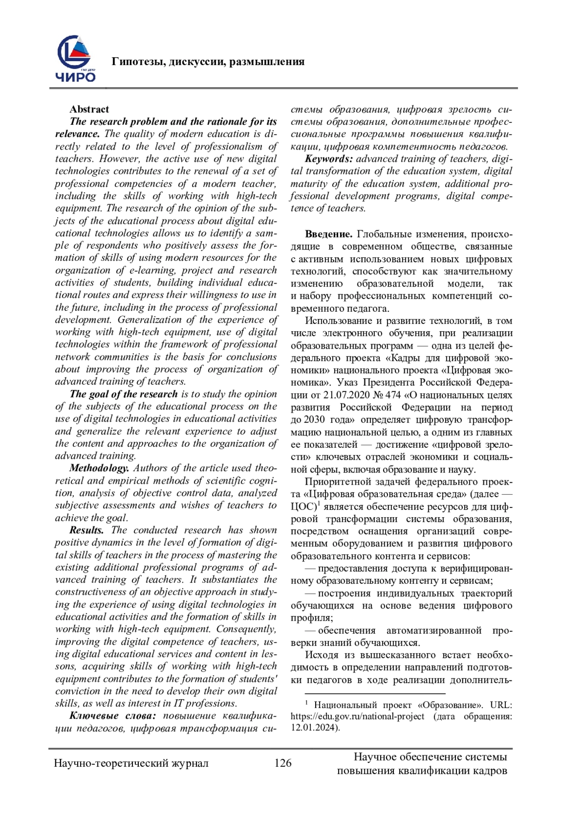 Проблема исследования и обоснование ее актуальности. Качество современного образования напрямую связывают с уровнем профессионализма педагогов. При этом активное использование новых цифровых технологий способствуют обновлению набора профессиональных компетенций современного учителя, включая навыки работы с высокотехнологичным оборудованием. Изучение мнения субъектов образовательного процесса о цифровых образовательных технологиях позволяет выявить выборку респондентов, которые положительно оценивают сформированность навыков использования современных ресурсов для организации электронного обучения, проектной и исследовательской деятельности обучающихся, построения индивидуальных образовательных маршрутов и выражают готовность использовать в дальнейшем, в том числе в процессе повышения квалификации. Обобщение опыта работы с высокотехнологичным оборудованием, использования цифровых технологий в рамках работы профессиональных сетевых сообществ является основанием для выводов о совершенствовании процесса организации повышения квалификации и профессиональной переподготовки педагогов. Целью исследования является изучение мнения субъектов образовательного процесса по использованию цифровых технологий в образовательной деятельности и обобщение соответствующего опыта для корректировки содержания и подходов к организации повышения квалификации. Методология (материалы и методы). Для достижения поставленной цели авторы статьи использовали теоретический и эмпирический методы научного познания, анализ данных объективного контроля, проанализированы субъективные оценки и пожелания педагогов. Результаты. Проведенное исследование показало позитивную динамику в уровне сформированности цифровых навыков педагогов в процессе освоения существующих дополнительных профессиональных программ повышения квалификации. Обосновывается конструктивность объективного подхода при изучении опыта использования цифровых технологий в образовательной деятельности и формировании навыков работы с высокотехнологичным оборудованием. Таким образом, повышение цифровой компетентности педагогов, использование на уроках цифровых образовательных сервисов и контента, получение навыков работы на высокотехнологичном оборудовании способствует формированию убежденности обучающихся в необходимости развития собственных цифровых навыков, а также интереса к профессиям IT-направления.