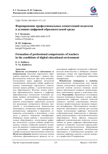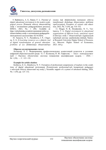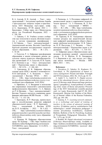 9. Рахимова, А. Э. Потенциал цифровой образовательной среды в современном педагогическом процессе / А. Э. Рахимова, Ф. Л. Ратнер. - Текст: электронный // МНКО. - 2023. - № 1 (98). - URL: https://cyberleninka.ru/article/n/potentsial-tsifrovoy-obrazovatelnoy-sredy-v-sovremennom-pedagogicheskom-protsesse (дата обращения: 16.02.2024). EDN: DVFXXT