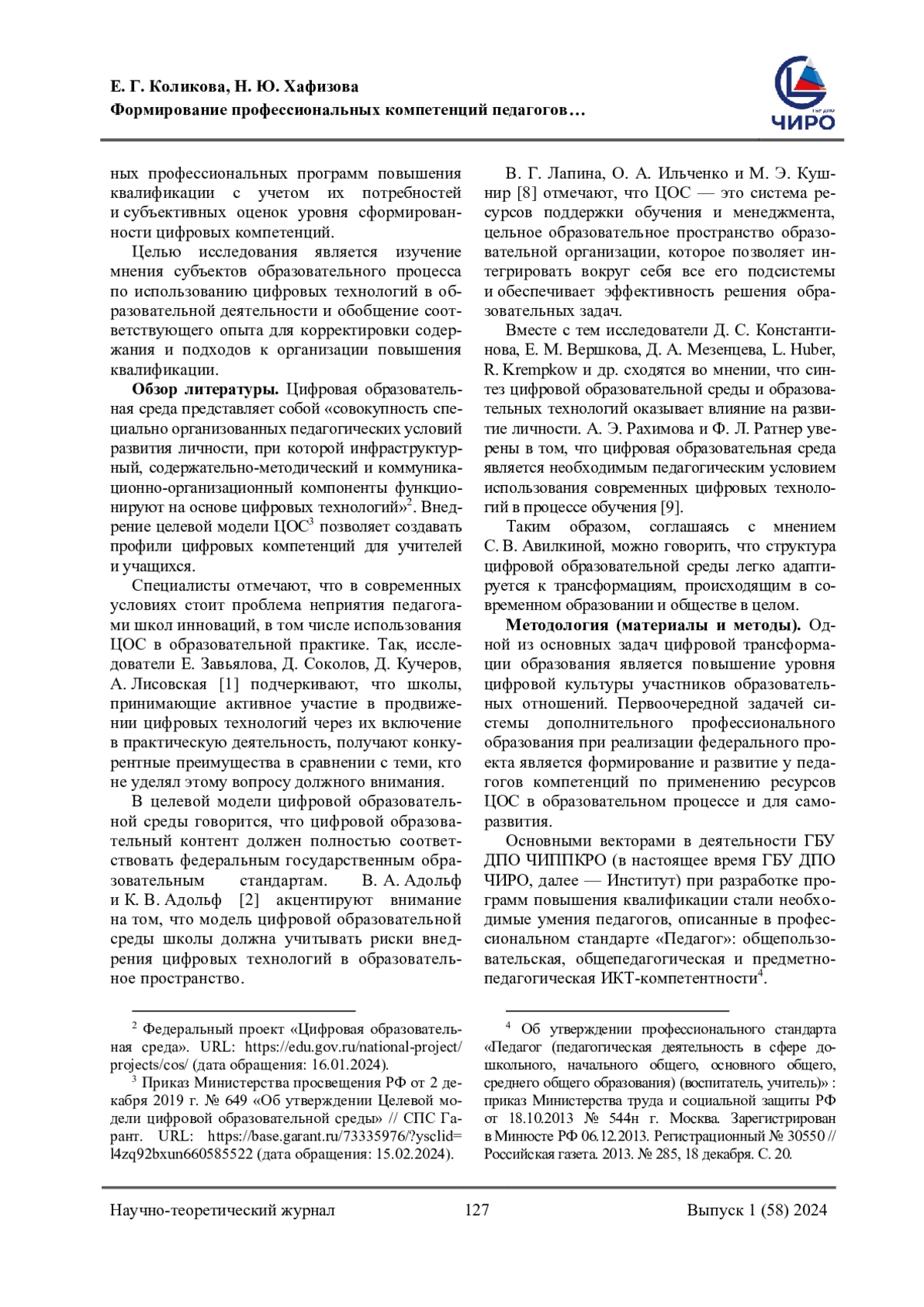 7. Крупецких, И. Р. Факторы, препятствующие и способствующие развитию цифровой образовательной среды / И. Р. Крупецких. - Текст: электронный // Вестник КГПУ им. В. П. Астафьева. - 2022. - № 4 (62). - URL: https://cyberleninka.ru/article/n/faktory-prepyatstvuyuschie-i-sposobstvuyuschie-razvitiyu-tsifrovoy-obrazovatelnoy-sredy (дата обращения: 16.02.2024). EDN: BQSEQD
