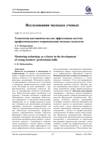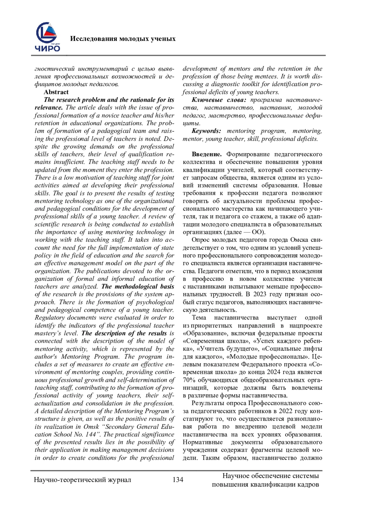 Проблема исследования и обоснование ее актуальности. В статье рассматривается вопрос о профессиональном становлении начинающего педагога и его закреплении в образовательных организациях. Отмечается проблема формирования педагогического коллектива и повышения профессионального уровня педагогов. Несмотря на рост требований к профессиональному мастерству педагогов, уровень их квалификации остается недостаточным. Педагогический корпус нуждается в обновлении с момента вхождения в профессию. Наблюдается низкая мотивация педагогических работников к совместной деятельности, направленной на их профессиональное развитие. Ставится цель представить результаты апробации технологии наставничества как одного из организационно-педагогических условий обеспечения качественного профессионального сопровождения молодых педагогов. Проводится обзор научных исследований, позволяющий установить значимость применения технологии наставничества в работе с педагогическим корпусом. Учитывается необходимость реализации в полном объеме государственной политики в сфере образования и поиском эффективной модели управления со стороны организации. Анализируются публикации, посвященные вопросу организации формального и информального образования учителей. Методологической основой исследования выступают положения системного и компетентного подходов. В них рассматривается становление психолого-педагогической компетентности молодого педагога. Проведен анализ нормативных документов с целью определения показателей уровня профессионального мастерства педагога. Описание результатов связывается с описанием модели наставнической деятельности, которая представлена авторской Программой наставничества. Программа включает перечень мероприятий по подбору основного педагога-наставника для молодого учителя, по определению наставнических групп с целью определения профессиональной траектории развития начинающего специалиста с учетом его профессиональных возможностей. В статье описан опыт внедрения Программы наставничества. Практическая значимость представленных результатов заключается в возможности их применения при принятии управленческих решений с целью создания условий для профессионального развития педагогов-наставников и закрепления в профессии наставляемых. Обсуждается диагностический инструментарий с целью выявления профессиональных возможностей и дефицитов молодых педагогов.