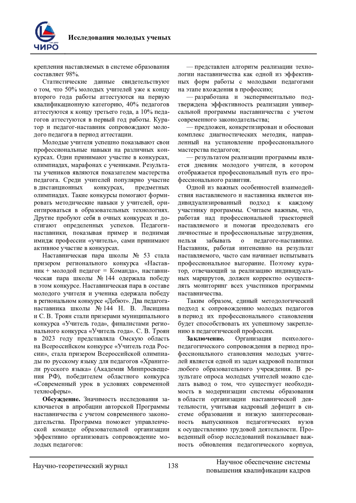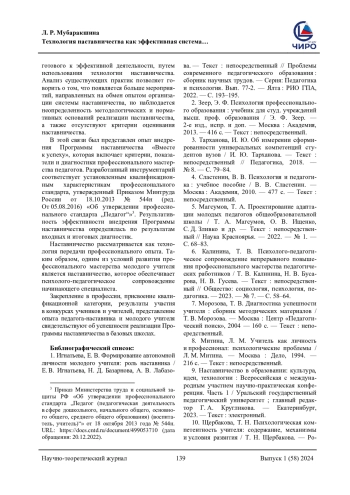 1. Игнатьева, Е. В. Формирование автономной личности молодого учителя: роль наставника / Е. В. Игнатьева, Н. Д. Базарнова, А. В. Лабазова. - Текст: непосредственный // Проблемы современного педагогического образования: сборник научных трудов. - Серия: Педагогика и психология. Вып. 77-2. - Ялта: РИО ГПА, 2022. - С. 193-195. EDN: BOPHCE