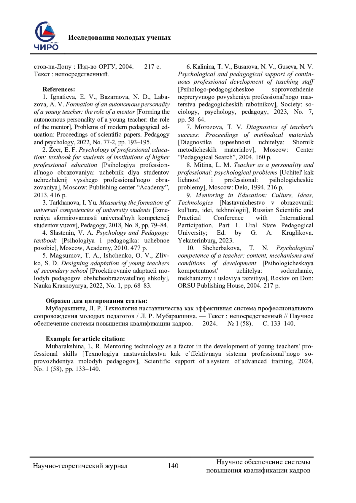 6. Калинина, Т. В. Психолого-педагогическое сопровождение непрерывного повышения профессионального мастерства педагогических работников / Т. В. Калинина, Н. В. Бусарова, Н. В. Гусева. - Текст: непосредственный // Общество: социология, психология, педагогика. - 2023. - № 7. - С. 58-64. EDN: YARTMV