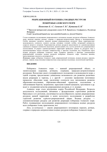 Статья посвящена исследованию рекреационного потенциала водных ресурсов побережья Азовского моря, включая морские, речные, озерные и природно-антропогенные (пруды и водохранилища). Особое внимание уделяется морским водным рекреационным ресурсам. Даны характеристики: мелководности, солености, ионного состава, основных течений, глубин, штормовой активности, скорости ветров и штормов. Характеристика речных ресурсов представлена по административным единицам и отражает количество водотоков, среднегодовой сток, густоту речной сети, рекреационное использование. В разрезе административных территорий приведены данные по ресурсам озер и проанализированы запасы питьевых поверхностных и пресных подземных вод. Разработана карта водных ресурсов побережья Азовского моря. Раскрыты причины и факторы, уменьшающие рекреационный потенциал водных ресурсов побережья Азовского моря, отмечены явления, представляющие опасность для рекреантов.
