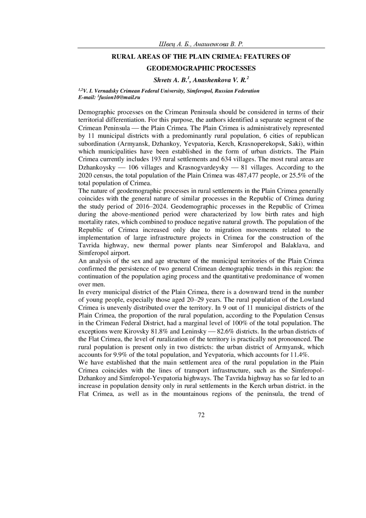 7. Швец А.Б., Киселёва Н.В., Воронин И.Н., Вольхин Д.А., Яковлев А.Н. Сельские территории Крыма: границы и содержание образа // Геополитика и экогеодинамика регионов“. 2021. Т.7 (17). Вып.3. С. 128-153. EDN: RTMGKZ