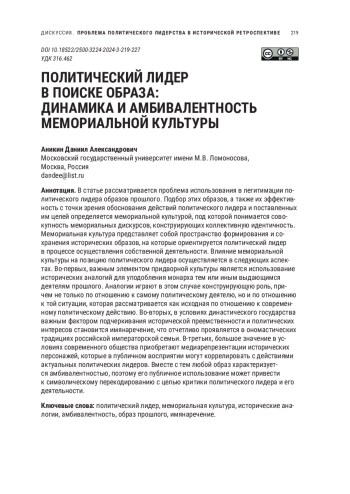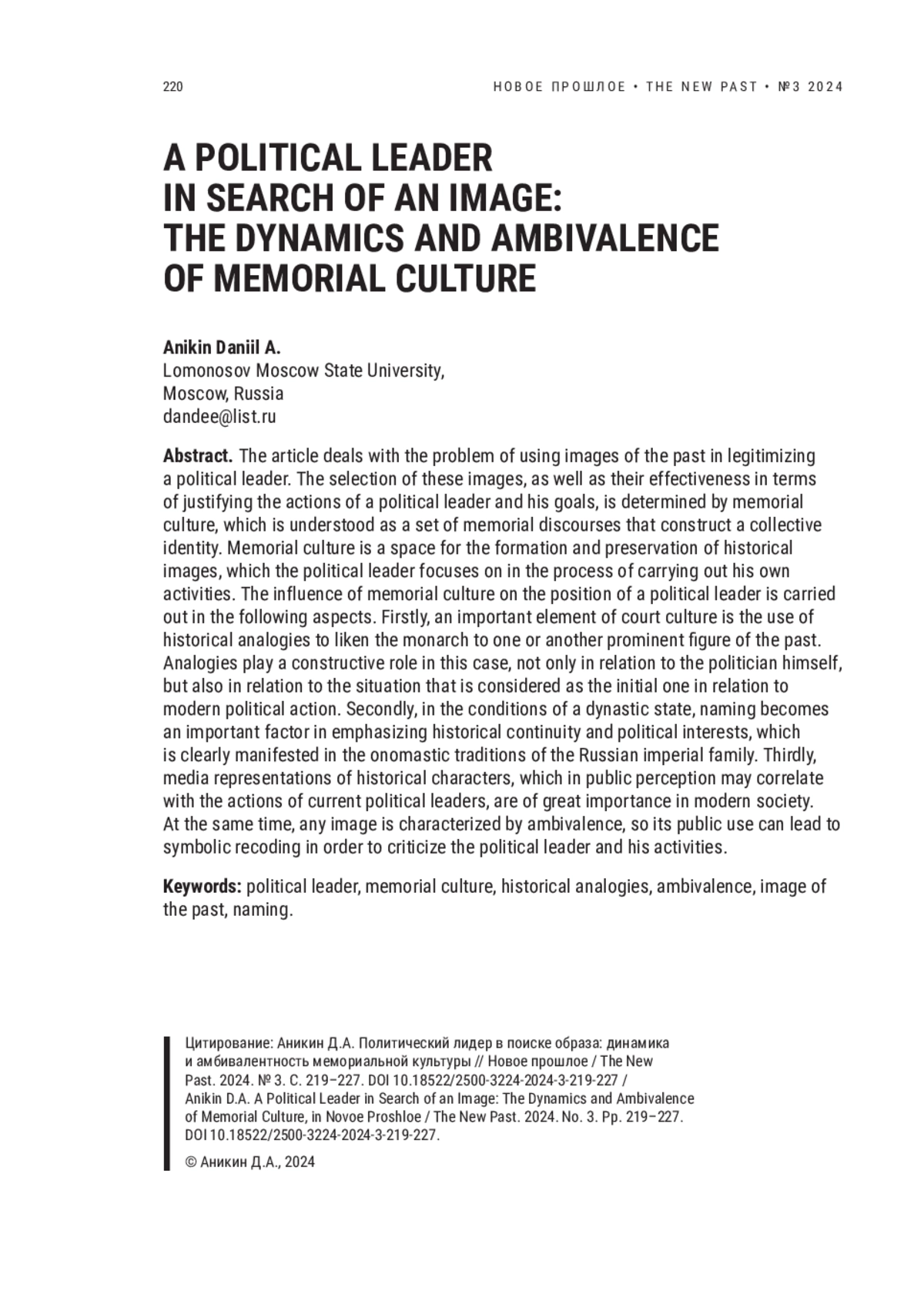 В статье рассматривается проблема использования в легитимации политического лидера образов прошлого. Подбор этих образов, а также их эффективность с точки зрения обоснования действий политического лидера и поставленных им целей определяется мемориальной культурой, под которой понимается совокупность мемориальных дискурсов, конструирующих коллективную идентичность. Мемориальная культура представляет собой пространство формирования и сохранения исторических образов, на которые ориентируется политический лидер в процессе осуществления собственной деятельности. Влияние мемориальной культуры на позицию политического лидера осуществляется в следующих аспектах. Во-первых, важным элементом придворной культуры является использование исторических аналогий для уподобления монарха тем или иным выдающимся деятелям прошлого. Аналогии играют в этом случае конструирующую роль, причем не только по отношению к самому политическому деятелю, но и по отношению к той ситуации, которая рассматривается как исходная по отношению к современному политическому действию. Во-вторых, в условиях династического государства важным фактором подчеркивания исторической преемственности и политических интересов становится имянаречение, что отчетливо проявляется в ономастических традициях российской императорской семьи. В-третьих, большое значение в условиях современного общества приобретают медиарепрезентации исторических персонажей, которые в публичном восприятии могут коррелировать с действиями актуальных политических лидеров. Вместе с тем любой образ характеризуется амбивалентностью, поэтому его публичное использование может привести к символическому перекодированию с целью критики политического лидера и его деятельности