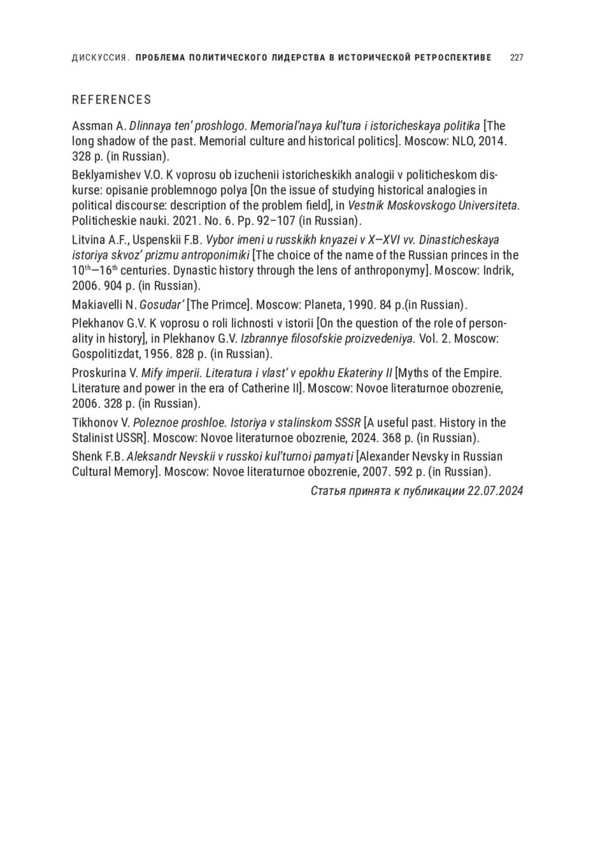 2. Беклямишев В.О. К вопросу об изучении исторических аналогий в политическом дискурсе: описание проблемного поля // Вестник Московского Университета. Политические науки. 2021. № 6. C. 92-107.