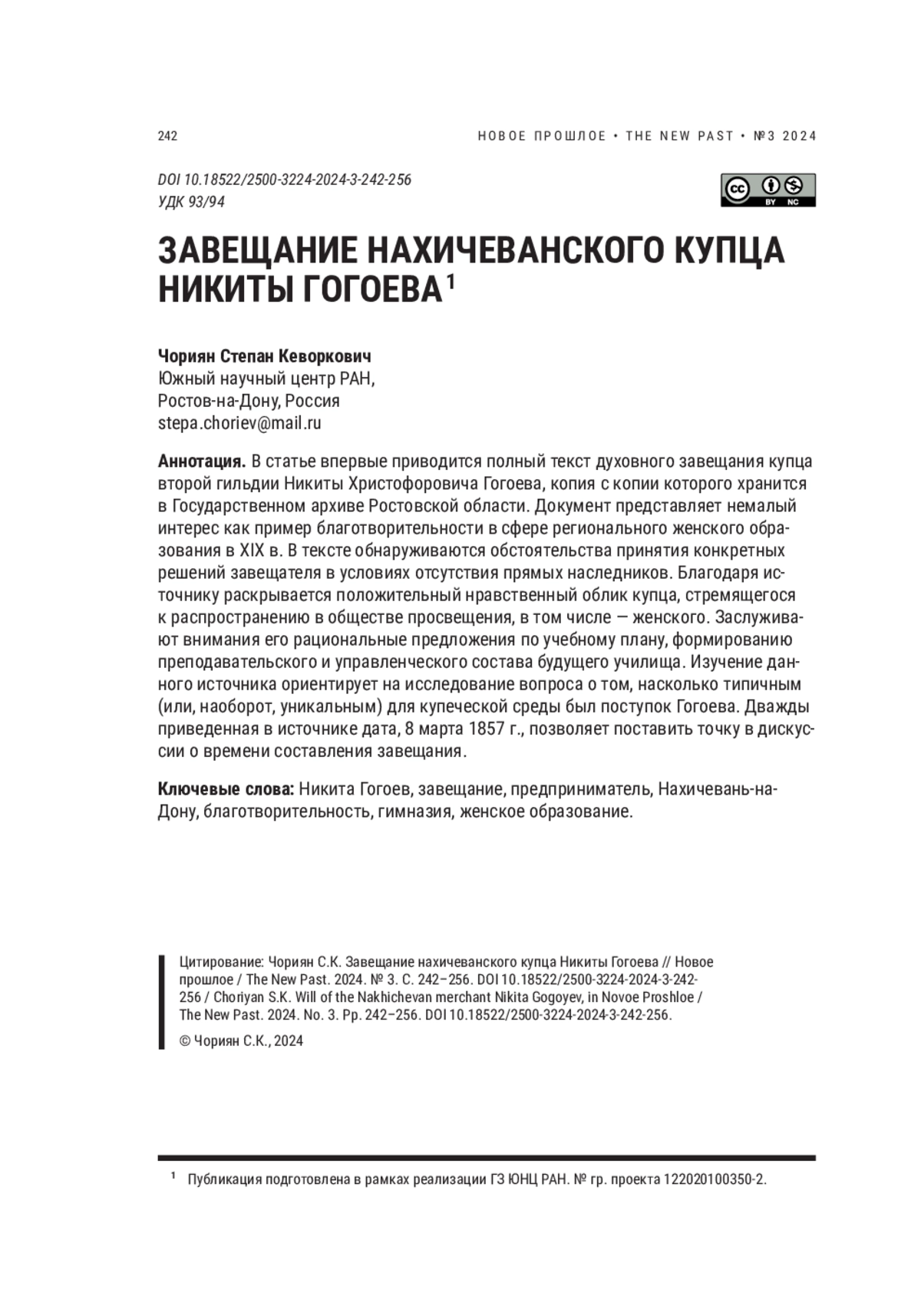 ЧОРИЯН С. К. ЗАВЕЩАНИЕ НАХИЧЕВАНСКОГО КУПЦА НИКИТЫ ГОГОЕВА // НОВОЕ ПРОШЛОЕ. 2024. № 3