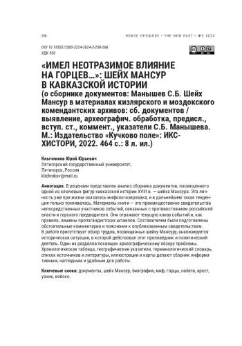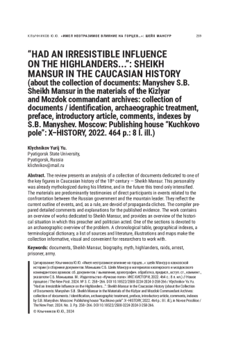 В рецензии представлен анализ сборника документов, посвященного одной из ключевых фигур кавказской истории XVIII в. — шейха Мансура. Эта личность уже при жизни оказалась мифологизирована, и в дальнейшем такая тенденция только усиливалась. Материалы книги — это преимущественно свидетельства непосредственных участников событий, связанных с противостоянием российской власти и горского предводителя. Они отражают текущую канву событий и, как правило, лишены пропагандистских штампов. Составителем были подготовлены обстоятельные комментарии и пояснения к опубликованным свидетельствам. В работе присутствует обзор трудов, посвященных шейху Мансуру, анализируется историческая ситуация, в которой действовал этот проповедник и политический деятель. Один из разделов посвящен археографическому обзору проблемы. Хронологическая таблица, географические указатели, терминологический словарь, список источников и литературы, иллюстрации и карты делают сборник информативным, наглядным и удобным для работы.