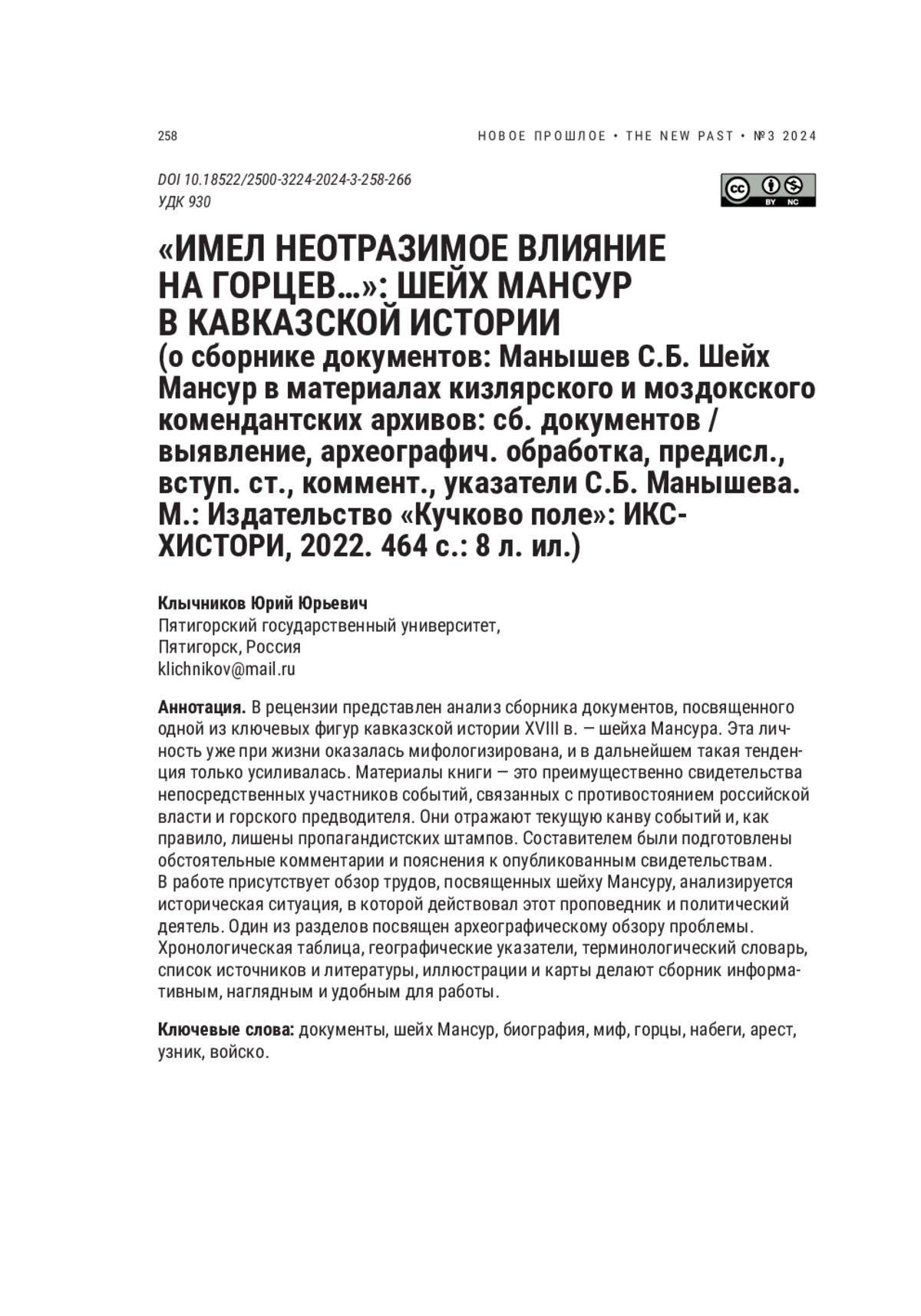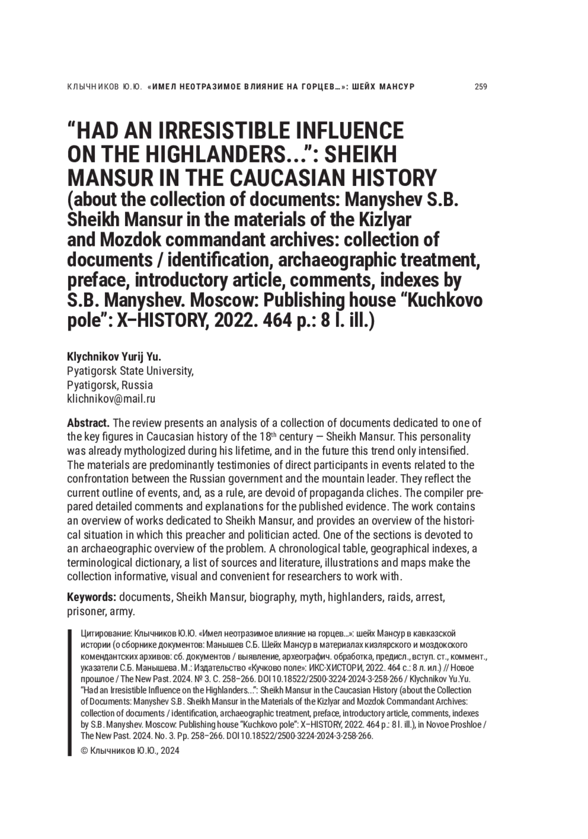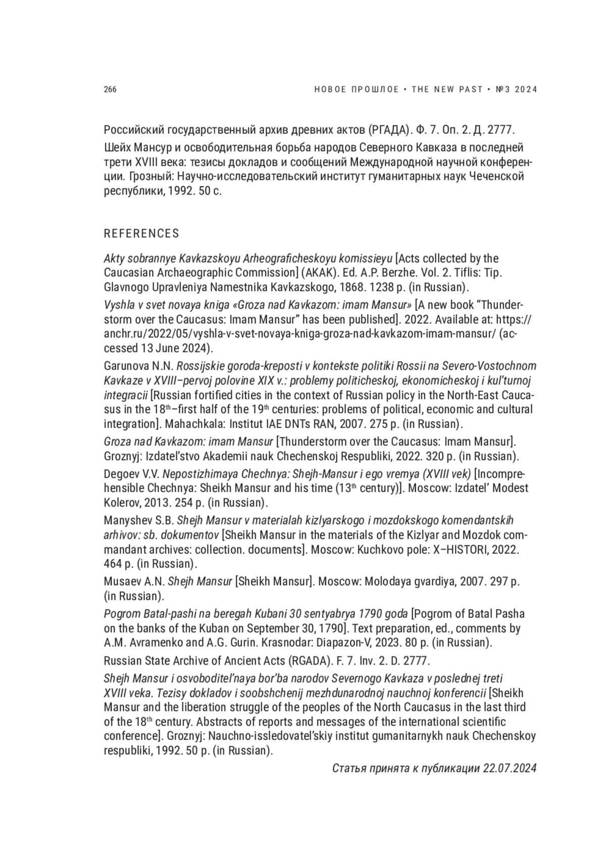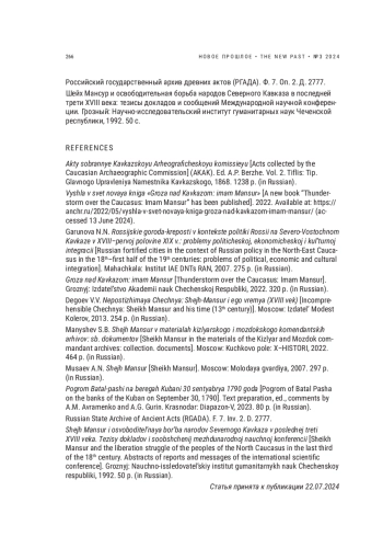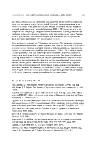 6. Манышев С.Б. Шейх Мансур в материалах кизлярского и моздокского комендантских архивов: сб. документов. М.: Кучково поле: ИКС-ХИСТОРИ, 2022. 464 с. EDN: RBNUAA