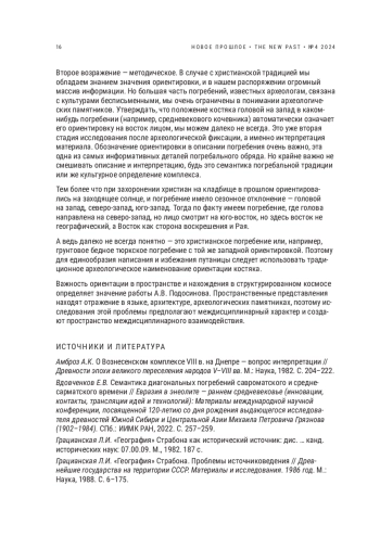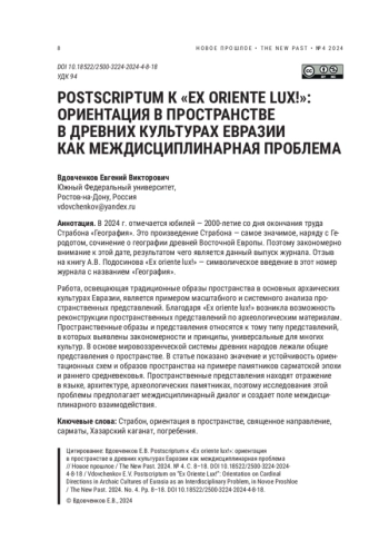 Работа, освещающая традиционные образы пространства в основных архаических культурах Евразии, является примером масштабного и системного анализа пространственных представлений. Благодаря «Ex oriente lux!» возникла возможность реконструкции пространственных представлений по археологическим материалам. Пространственные образы и представления относятся к тому типу представлений, в которых выявлены закономерности и принципы, универсальные для многих культур. В основе мировоззренческой системы древних народов лежали общие представления о пространстве. В статье показано значение и устойчивость ориентационных схем и образов пространства на примере памятников сарматской эпохи и раннего средневековья. Пространственные представления находят отражение в языке, архитектуре, археологических памятниках, поэтому исследования этой проблемы предполагает междисциплинарный диалог и создает поле междисциплинарного взаимодействия.