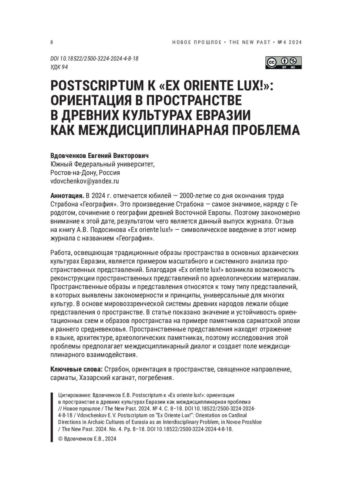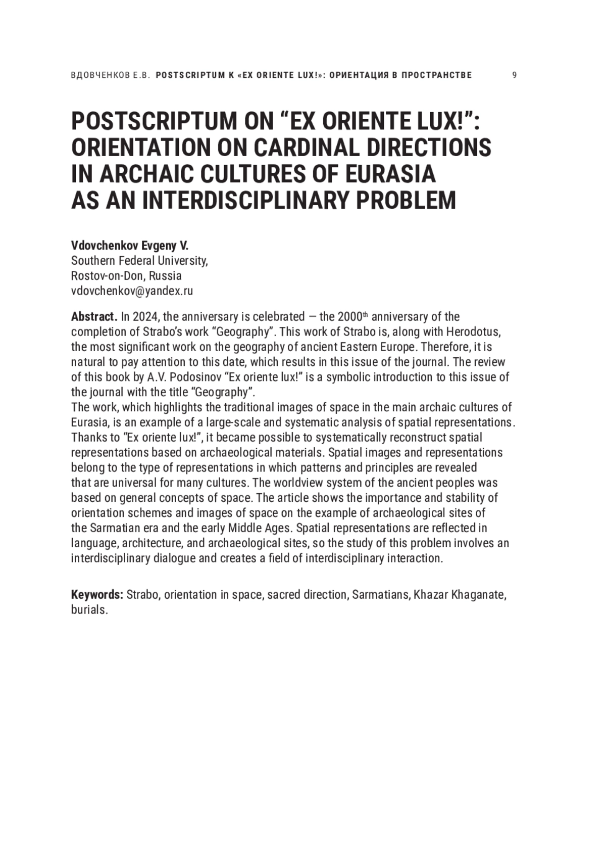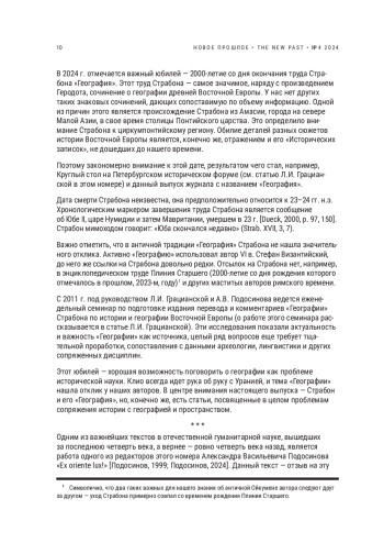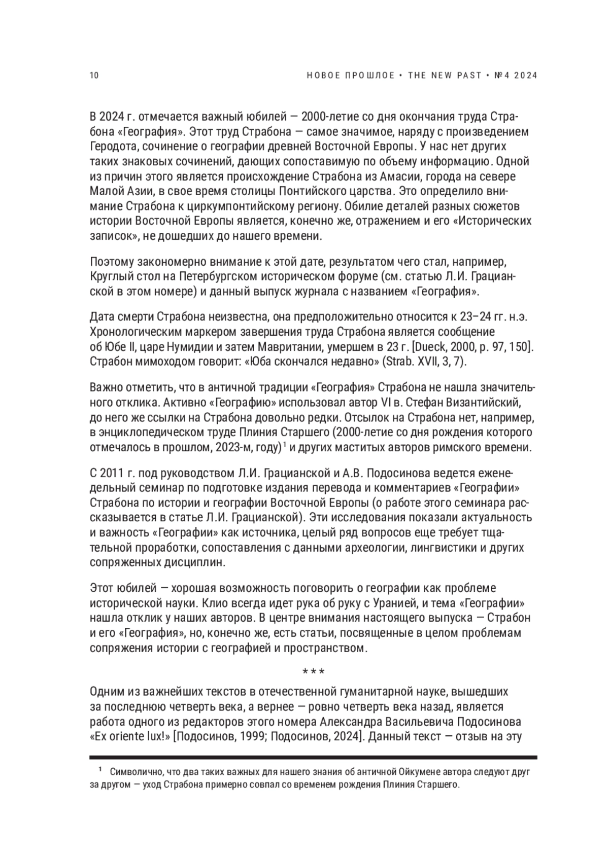 В 2024 г. отмечается юбилей — 2000-летие со дня окончания труда Страбона «География». Это произведение Страбона — самое значимое, наряду с Геродотом, сочинение о географии древней Восточной Европы. Поэтому закономерно внимание к этой дате, результатом чего является данный выпуск журнала. Отзыв на книгу А. В. Подосинова «Ex oriente lux!» — символическое введение в этот номер журнала с названием «География».
