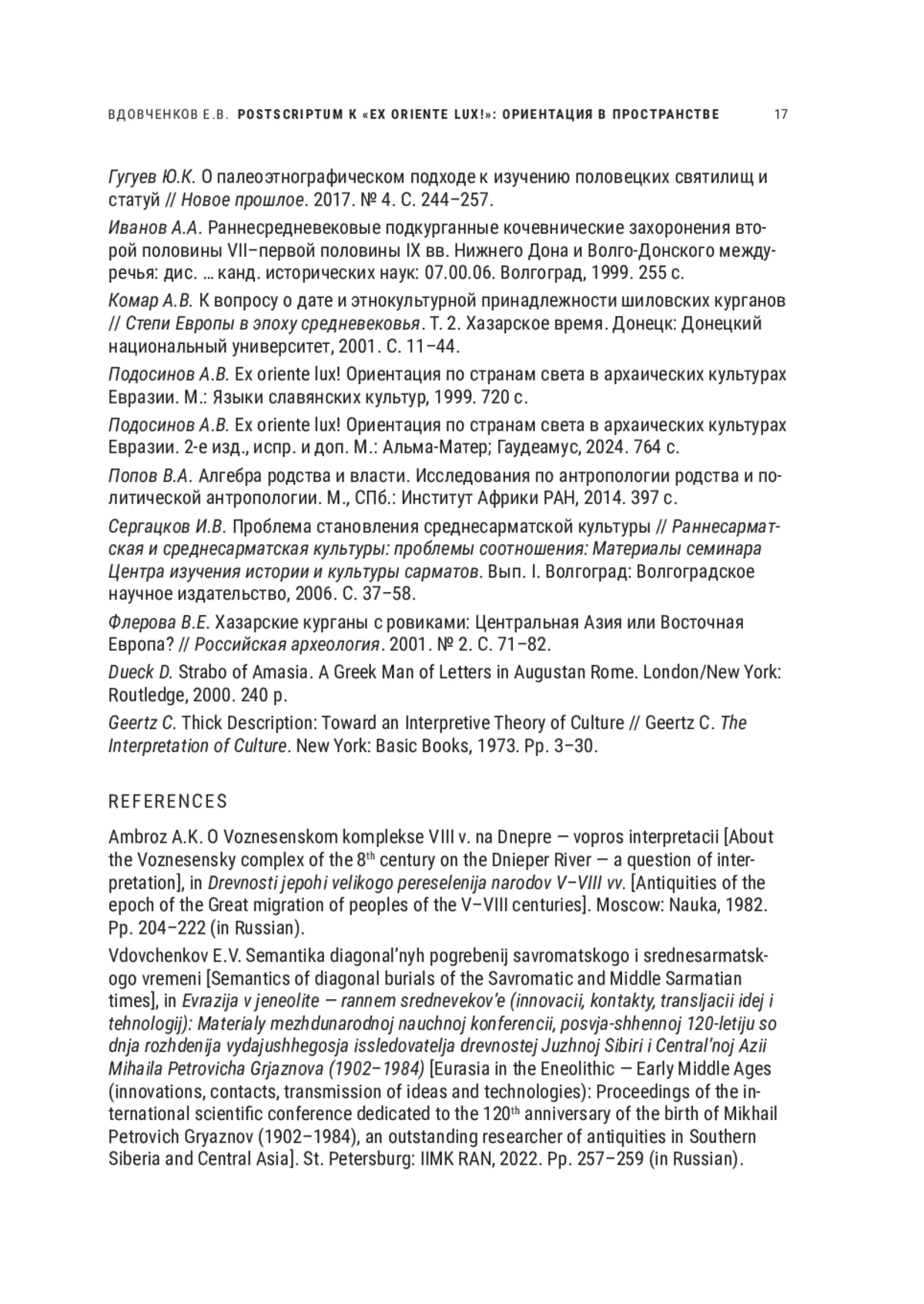2. Вдовченков Е.В. Семантика диагональных погребений савроматского и среднесарматского времени // Евразия в энеолите - раннем средневековье (инновации, контакты, трансляции идей и технологий): Материалы международной научной конференции, посвященной 120-летию со дня рождения выдающегося исследователя древностей Южной Сибири и Центральной Азии Михаила Петровича Грязнова (1902-1984). СПб.: ИИМК РАН, 2022. С. 257-259. EDN: OBGTRW