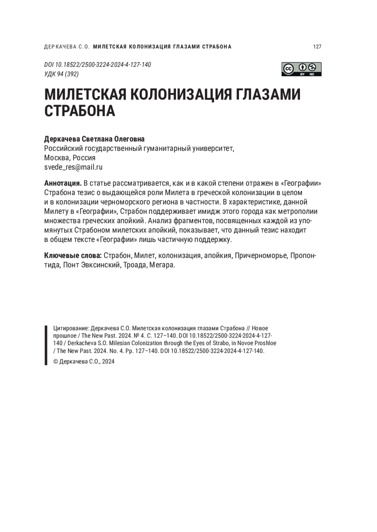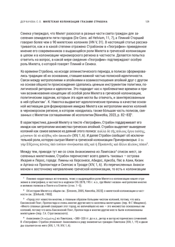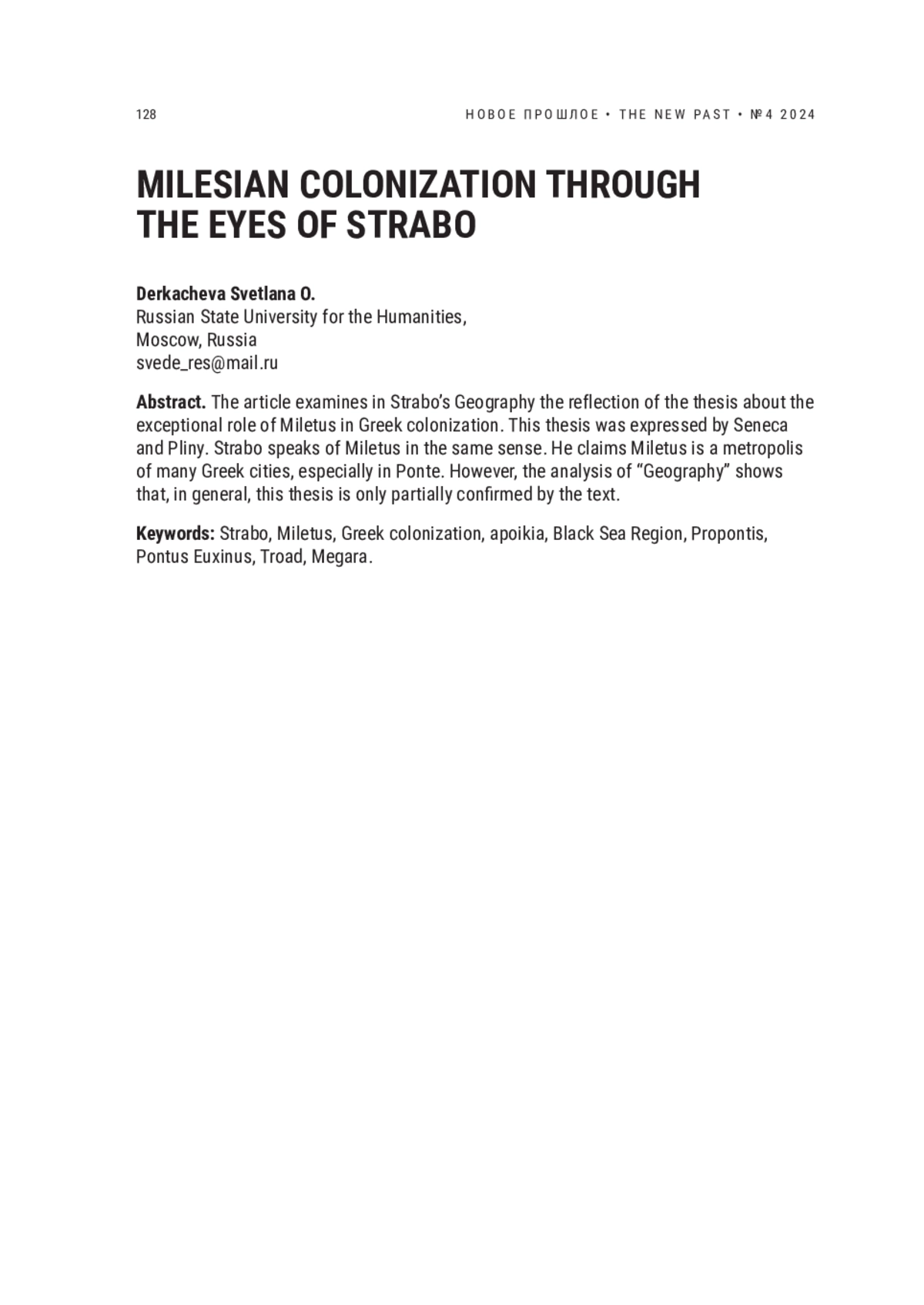 Сенека утверждал, что Милет разослал в разные части света граждан для заселения семидесяти пяти городов (De Cons. ad Helvium, 11, 7), а Плиний Старший говорил более чем о 90 милетских колониях (HN V, 31). В настоящей статье рассматривается, как и в какой степени отражено Страбоном в «Географии» приведенное мнение его современников о выдающейся роли Милета в греческой колонизации в целом и в колонизации черноморского региона в частности. Делается попытка ответить на вопрос, в какой мере сведения «Географии» подтверждают особую роль Милета, о которой говорят Плиний и Сенека