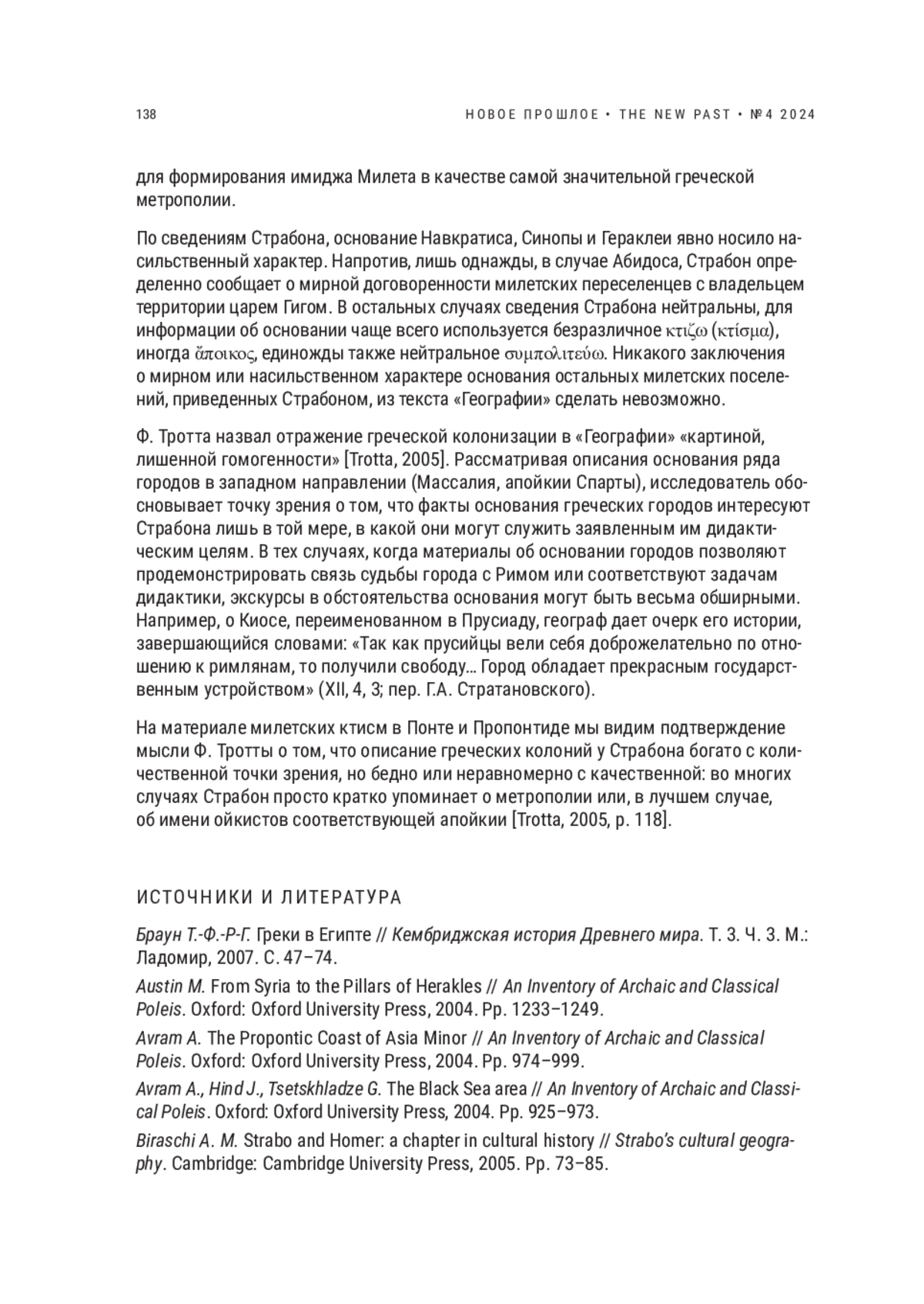 20. Trotta F. The foundation of Greek colonies and their main features in Strabo: a portrayal lacking homogeneity? // Strabo’s cultural geography. New York: Cambridge University Press, 2005. Pp. 118-128.