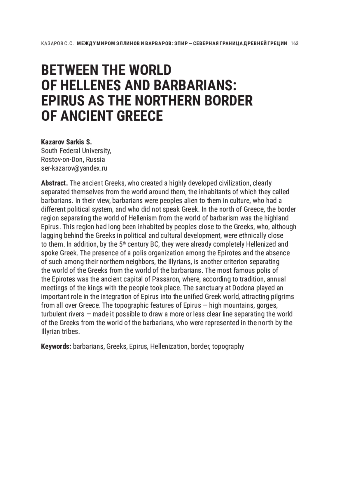 Древние греки, создавшие высокоразвитую цивилизацию, четко отделяли себя от всего окружающего их мира, обитателей которого они называли варварами. В их представлении варварами являлись народы, чуждые им по культуре, имевшие иное политическое устройство, не говорившие на греческом языке. На севере Греции пограничной областью, отделяющей мир эллинства от мира варварства, являлся высокогорный Эпир. Эта область издавна была населена близким к грекам народами, которые хотя и отставали от греков в политическом и культурном развитии, в этническом отношении были близки к ним. К тому же к V в. до н. э. они уже были полностью эллинизированы и говорили на греческом языке. Наличие полисной организации у эпиротов и отсутствие таковой у северных соседей, иллирийцев, — еще один критерий, помогающий отделить мир греков от мира варваров. Наиболее известным полисом эпиротов была древняя столица Пассарон, где по традиции проходили ежегодные встречи царей с народом. Важную роль в интеграции Эпира в единый греческий мир сыграло святилище в Додоне, привлекавшее к себе паломников со всей Греции. Топографические особенности Эпира — высокие горы, ущелья, бурные реки — позволяли прочертить более или менее четкую границу, отделяющую мир греков от мира варваров, которые на севере были представлены племенами иллирийцев
