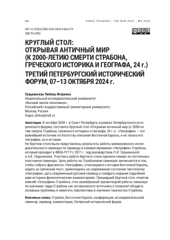 На Круглом столе были представлены результаты работы межвузовского исследовательского семинара по переводу и комментированию «Географии» Страбона, который проходит в ИВКА РГГУ с 2011 г. под руководством Л. И. Грацианской и А. В. Подосинова. Участие в работе Круглого стола приняли семеро из постоянных участников семинара. Цель работы на Страбоновом семинаре заключается в том, чтобы собрать фрагменты «Географии», относящиеся к истории Восточной Европы, издать их греческий текст, ориентируясь на современное состояние текстологии «Географии», дать современный русский перевод и снабдить издание подробнейшим историко-филологическим комментарием. Прошедший Круглый стол, отметив юбилей «Географии» Страбона, стал своеобразной презентацией работы семинара по изучению труда Страбона как исторического источника и позволил обсудить основные проблемы и наметить перспективы в изучении творчества Страбона