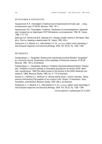 2. Грацианская Л.И. “География” Страбона. Проблемы источниковедения // Древнейшие государства на территории СССР. Материалы и исследования. 1986. М.: Наука, 1988. С. 6-175. EDN: PVEHWF