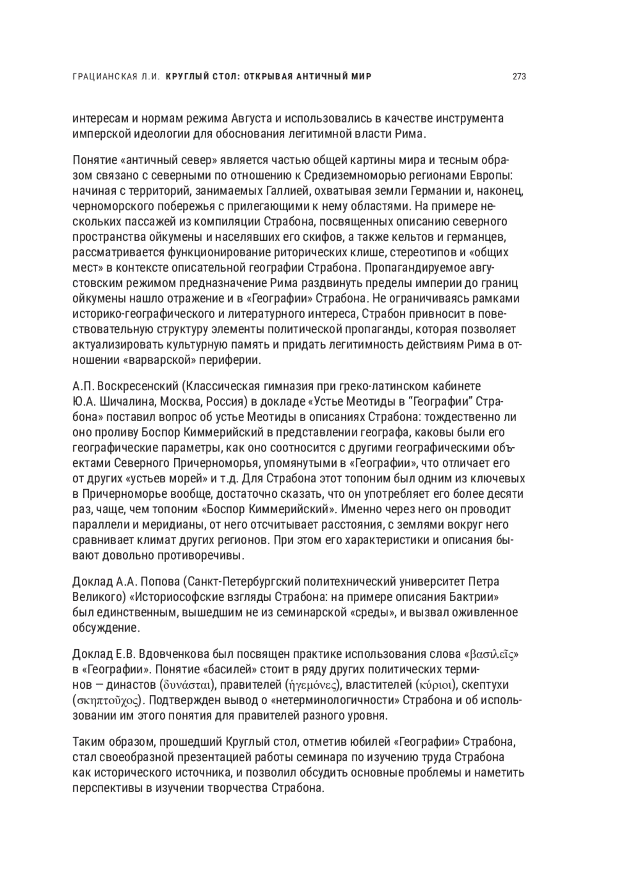 «География» Страбона — это важнейший источник по истории и географии античного м ира. Этот Круглый стол идет в рамках изучения «Географии» Страбона как ключевого источника по истории Восточной Европы. Без преувеличения можно сказать, что для нас это важнейший источник по богатству описания этого региона, и не только его географии, но и истории. Ни одно другое античное сочинение не может сравниться с ним в этом. И это объяснимо. Сам Страбон происходил из малоазийского города Амасия, его предки были важными участниками исторических событий циркумпонтийского региона, поэтому он обладал уникальной историко-географической информацией. Вот почему ушедший из жизни 2000 лет назад историк и географ Страбон находится в центре нашего внимания.