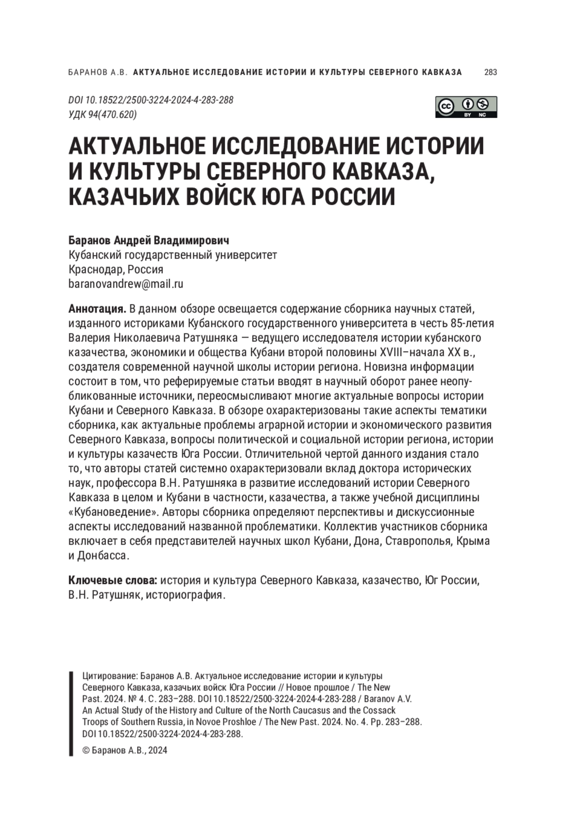 В данном обзоре освещается содержание сборника научных статей, изданного историками Кубанского государственного университета в честь 85-летия Валерия Николаевича Ратушняка — ведущего исследователя истории кубанского казачества, экономики и общества Кубани второй половины XVIII–начала ХХ в., создателя современной научной школы истории региона. Новизна информации состоит в том, что реферируемые статьи вводят в научный оборот ранее неопубликованные источники, переосмысливают многие актуальные вопросы истории Кубани и Северного Кавказа. В обзоре охарактеризованы такие аспекты тематики сборника, как актуальные проблемы аграрной истории и экономического развития Северного Кавказа, вопросы политической и социальной истории региона, истории и культуры казачеств Юга России. Отличительной чертой данного издания стало то, что авторы статей системно охарактеризовали вклад доктора исторических наук, профессора В. Н. Ратушняка в развитие исследований истории Северного Кавказа в целом и Кубани в частности, казачества, а также учебной дисциплины «Кубановедение». Авторы сборника определяют перспективы и дискуссионные аспекты исследований названной проблематики. Коллектив участников сборника включает в себя представителей научных школ Кубани, Дона, Ставрополья, Крыма и Донбасса